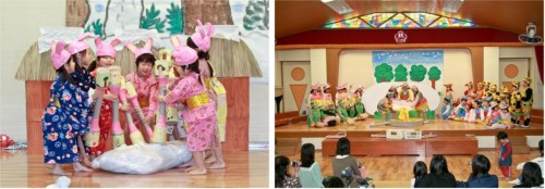 年少さんと年中さんは劇遊びをしました。年少さんは役になりきって、うたや踊りを楽しみながら、話のことばを覚え、保護者の皆様に見ていただきました。感動の涙とほほえましさの笑顔と温かいまなざしであふれていました。のびのびと表現する子ども、恥ずかしがったり、興奮したり、緊張したりといろいろな気持ちを出しながらの発表でした。年中さんはお話がどんどん膨らみ、子どもたちからのアイデアを取り入れながら楽しい劇ができました。保護者の皆様もニコニコ笑顔で見ていただきました。クラスの子どもたちの成長を一緒に感じられた発表会でした。