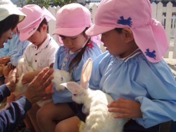 今日はいろいろな動物たちが幼稚園にやってきました。子どもたちはひよこやうさぎやモルモットをだっこしたり、やぎやひつじ、ロバや大きいカメ、アヒルと触れ合って大喜びでした。初めて動物と触れ合う子どもたちも多く怖がる子どももいましたが少しずつ慣れて触ることができたようです。年長さんはポニーに乗せてもらいました。午後はお礼にえさをたくさんあげました。それも楽しい経験でした。さくらんぼくらぶのお友だちもお母さんと一緒に楽しんでいました。小さな動物と触れ合って、優しい心と命の尊さを感じてくれたらいいなと思います。