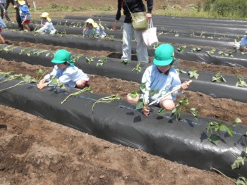 年長さんはカントリーパークの畑においもの苗を植えに行きました。自然体験、食育の一環です。きれいにビニールがかけられた畑に、たけの棒を印まで土の中に差し込んで、お芋の苗を入れます。根元が土で隠れるよう手で押さえて、出来上がりです。秋の収穫には全園児できます。年長さんはみんなの分まで、頑張って植えました。幼稚園でも苗を植えて、生長を観察します。4月遠足で植えた落花生の芽が出ていました。カラスに食べられないようにきらきらテープが張ってありました。バラ園にはきれいなバラがたくさん咲いていました。その中を散歩して香りを楽しみました。