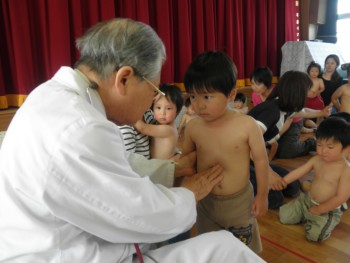 今日は内科健診をしました。園医の石橋先生はやさしい先生です。でも、初めての子どもたちは病気の時や予防接種の時にしか合わないお医者様はちょっと怖い存在のようでもあります。ましてや、悪いことをして怒られる時「お医者さんに大きな注射をしてもらいますよ」などと言われていたらもう大変。「みんなの体が元気かどうか見てもらいますよ。お口を大きくあけて見せてね。痛くも怖くもないよ。」というのですが、疑心暗鬼のこの表情。でも、やさしく声かけをしていただいて、終わるとほっとした様子でした。中には口を一文字にふさいで絶対あけない子もいました。知らないおじさんですもの、警戒するのも無理はありません。年長さんはとても上手に受けていました。経験は大事です。