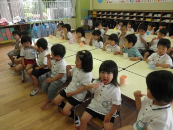 きょうは虫歯予防の日です。新入児さんもだんだん幼稚園生活に慣れてきましたので、昼食の後歯磨きをするようにします。お家ではおかあさんにしてもらっているでしょうが、自分でも上手にできるようにCDに合わせて、歯の磨き方を練習しました。でも、歯磨きだけは小学校に上がってもしばらくは仕上げをしてあげてください。歯は体の中で最も早く大人になるところです。歯並びは印象を良くします。丈夫な歯は健康を保ちます。歯のケアは子育ての大切なポイントだと思います。8020運動ご存じですか。自分の歯を多く保つことが長生きの秘訣です。6月10日は歯科検診と歯の健康についての講話を行います。