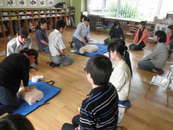 プール開きに合わせて、清水消防署の救急隊の方に職員の救急法講習をお願いしました。毎年この時期に実施しています。子どもがプールでおぼれたことを想定しての実地訓練と心肺蘇生の練習、AIDの操作確認、いろいろな事故の初期対応などです。年に1度の訓練は意識の向上には大切なものです。幼稚園での水遊びでは万が一の事故もないように十分配慮して行います。しかし、どんな事故にいつ遭遇するかはわかりません。そんなときでも傍観者ではなく、率先して協力できるようになりたいと思います。6月17日は保護者対象の救急法講習会をしていただきます。清水消防署の方にはお忙しい中をおいでいただきますので、たくさんの皆様のご参加をお願いします。