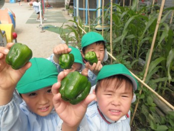 ピーマンがたくさんできてきました。年少さんとひよこ組さんはピーマンの料理を作りました。まず、先生がピーマンを切ります。たて、よこに切って中がどうなっているのか、どんな形に見えるか、確かめました。中にあるのは「まめ」「ごま」形は「ベンツのマーク」と答えた子どもがいましたよ。これを機会にいろいろな食材の名前、形、種の付き方などに興味を持つようなかかわりをしてください。保育参加のお母様方と一緒にピーマンを切ってみました。包丁を持って、左手を猫の手にして上から手を添えてもらい、挑戦です。ドキドキより、わくわくのようで自分で大胆に包丁を動かそうとする子どももいて、力のコントロールが大変だったようです。お家では絶対一人で持たないように約束はしました。千切りのピーマンを職員室で料理しました。サラダ油で炒め、ごま油で風味を出し、砂糖をからめ、しょうゆを少し鍋肌に入れ、鰹節とたっぷりの愛情を絡めて出来上がりです。生のピーマンを食べて言葉なく口から出す子どももいましたが、「おいしい。」と食べる子どももたくさんいたのにびっくりしました。味付けしたピーマンはどうでしょう。やっぱり食べられない子どももいましたが、たくさんの子どもたちが「おいしい!」と食べてくれました。食育は①多くの食材を知り、料理を味わうこと②体にいいものを知り、栄養のバランスを考えて食事をすること③食生活に必要な習慣や態度を身に付け食事が楽しいと感じることなどがあります。幼児期に大切なことをたくさん経験できるようにしていきたいと思います。
