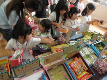 今日は保護者会主催のおまつり会がありました。雨も降らず、陽も照らず、ちょうどいいお天気の中、みんな楽しく遊ぶことができました。きのうの大雨も準備をするころにはあがり、本当によかったです。4月から今日まで、役員さんをはじめ、委員の皆様はアイディアを出し合い、毎日のように準備をされ、今日の日を迎えられました。ご苦労様でした。今年は年長さんの買い物体験を計画されました。子どもたちはクラスや家庭でお金の使い方について話し合いを重ね、今日を迎えました。年長さんははたくさんの駄菓子を前に50円分をどれにしようかと悩みながら決め、会計で5個の品物とお金を出して買い物をするとほっとした表情から「やった」と満足の笑顔になり、とてもうれしそうでした。それを少し離れて初めてお使いに出すような気持ちで見守っていらっしゃるお母様もいらっしゃいました。他の学年は親子で買い物をされました。ゲームコーナーもそれぞれに工夫がなされ、楽しく遊んでいました。本当に楽しい一日でした。保護者の皆様のご協力に心から感謝いたします。