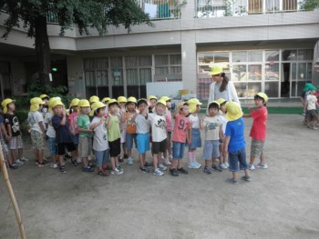 お泊り会二日目。朝一番に起きたのは誰でしょう。5時30分、目が覚めて、どうしてもじっとしていられないY君。テラスに出て、外を眺めていると、「鳥の鳴き声がするね。」「気持ちいいね。」といつもより早起きしてちょっと得した気分です。そのうちに仲間が増え、蝉の鳴き声もし始めて、幼稚園がにぎやかになってきました。6時カーテンを開けて「おはよう」と声をかけるとすぐに「おはよう」と声がかえってきました。あら、あまり眠れなかったかしら。でも、ほとんどの子どもたちは周りがにぎやかになってやっと目を覚ましました。それでも、起きない子どももいましたよ。タオルをたたんで、顔を洗って、服を着替えて、お散歩に出かけました。
