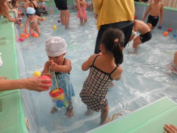 きょうはさくらんぼくらぶさんのみずあそびをしました。昨日は雨。今日もまだ、雨が残っていて、水遊びができるかな?と心配しましたが、すこし、日差しが見え、気温は30℃ありましたのでみずあそびを20分ほどすることができました。しっかり体を温める体操をして、2階の大きいプールで水を少なくして遊びました。はじめは水を怖がっていた子どもたちもペットボトルで作ったジョーロで水をかけたり、カラーボールで遊んだりする内に、笑顔がでてきました。プールから上がってよく体を拭いてもらって、お茶を飲んで、紙芝居と絵本を読んでもらいました。ペットボトルの手作りジョーロをもらって大喜び。また水遊びに来てください。
