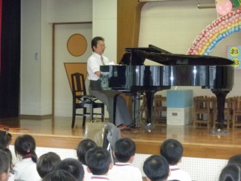 年長さんは音楽会恒例の「歓喜の歌」合唱を熊大教授で声楽家の平和先生に指導していただきました。今年はほとんど初めての状態からの練習でしたが平和先生の指導を真剣に聞いて頑張りました。姿勢、息の仕方、ドイツ語の発音の仕方、日本語の出し方、など1時間丁寧に指導していただきました。また、みんなが知っているちょうちょの原曲はドイツの歌だということも先生の歌を聞かせていただき知ることができました。大学の教授で声楽家の先生から子どもたちが指導をしてもらう経験は素晴らしいことだと思います。これから、少しずつ練習していきます。音楽会をお楽しみに…