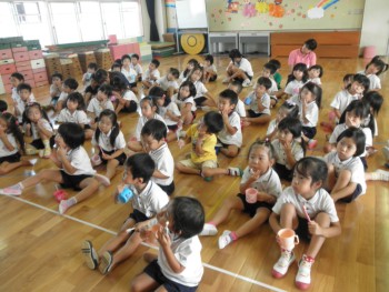 年中さんは昼食後、歯磨き・水うがいをして、フッ化物洗口剤でうがいをします。今日は北保健福祉センターの歯科衛生士の方に来ていただいて、歯磨きの仕方の再確認とぶくぶくうがいの仕方を教えていただきました。歯磨きは6月から今までやってきていますが、もう一度、どこをどのように磨くか丁寧に教えていただきました。ぶくぶくうがいは口をしっかり閉じて水がこぼれないように右・左・前に水を送り、動かします。コップに出した水が泡立っていれば上手にできた証拠です。一週間水で練習した後、液を入れてはじめます。お家でもしっかり練習しましょう。虫歯予防に心がけていきましょう。