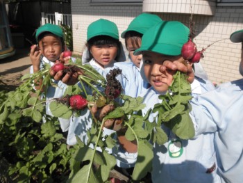 きょうは年長さんがラディッシュを収穫して食べました。春まきはあおむしさんに葉っぱを食べられるのでなかなかきれいに大きくなりませんが、秋まきは葉っぱも根もきれいに育ちます。二十日大根と言うように、運動会前に蒔いたものがちょうどいいくらいに生長しました。プランターから引き抜くと真っ赤で丸い根がでてきました。大根は「からっ!」でも食べられました。葉っぱも生で食べました。「べっ!むり。」やっぱり葉っぱでした。でもしっかり食べてしまった子どももいて、その様子がさすが年長さんだなあと思いました。さっと湯がくとおひたしで食べたりできます。ビタミン豊富で栄養満点ですけどね。・・・
