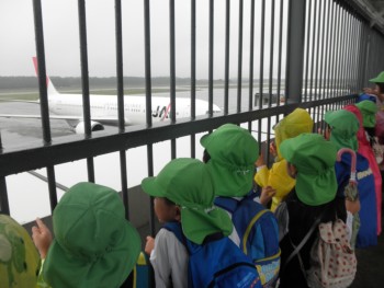 今日はあいにくの雨でしたが年長さんはレインコートと傘を持って空港へ見学遠足に行きました。出発時は小雨でしたので、バスの中で「空港に着いたら、雨がやんでるといいね。」と期待しながら行きましたが、雨は本降りになってしましました。それでも、年長さんは元気。屋上に上がるとちょうどJALが到着。間もなくANAも到着。SKYはもうすぐ飛び立とうとするところでした。弁当はどこで食べようかと思案していましたが、空港の配慮で邪魔にならないように3階の通路で食べることができました。ちょうど小学生の描いた夢の飛行機の絵が展示してあり、見ることができました。
