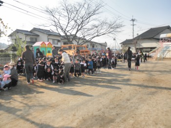 今日は子どもたちには内緒で火災避難訓練をしました。いつものように、お部屋で朝の歌を歌ったり、出席をとったりしていると突然のベルの音。すぐ後に外にでるように放送があり、一気に外へ飛び出してきました。ちゃんとハンカチを口にあてている子どもがいます。ひよこ組さんや年少さんで泣いている子どもはいません。担任の話ではベルが鳴った時、みんな、びっくりして動きが止まったそうですが、先生の「なんだろうね。静かに聞いて。」の声に真剣に耳を傾けていたそうです。まだ、2回目ですが、訓練の成果と日頃の話の聴き方が育っていることをうれしく思いました。『火遊びをしないこと』『もし、火事を見つけたら、大人に知らせること。逃げること。』『119は知っていても子どもはしないこと』『煙を吸わないように鼻口を覆うこと』『デパートなど逃げるところのマークを確認すること』幼稚園にもあります。「いくつあるか見つけてください。」と伝えていたら、すぐに年長さんが探してきました。ご家庭でも折に触れ、防火、防災、防犯、交通安全などの話をしていただきたいと思います。