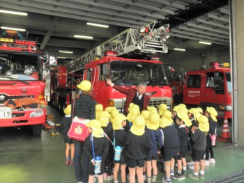 給水タンクを搭載した消防車、40m以上伸びるはしご車、レスキュー車などいつもは見ない消防車を見学させてもらいました。日頃の訓練が子どもたちの身に付いているか指導の在り方を見直す必要を感じました。