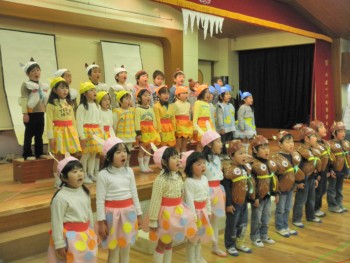 今日は年中すみれ組とうめ組の劇遊び参観でした。数冊絵本を読んでもらって、即興劇遊びを経験しました。どちらのクラスも子どもたちが選んだのはばばばあちゃんシリーズでした。子どもを引き付ける魅力があるのでしょうね。ねらいは『絵本に親しみ、言葉や会話に興味を持つ。みんなでイメージを共有し、言葉のやり取りを大切にしながら、役になりきって演じることを楽しむ。』などです。それぞれにクラスのカラーが出ていて楽しい劇でした。相手の言葉を聞き、それを受けて話を進める姿、子どもたちの満面の笑顔と物語の中に入りんでいる姿に1年間の成長を見ることができました。