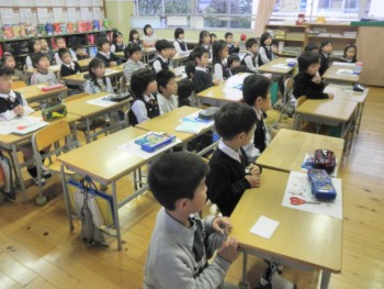 2年生との交流会です。体育館で2年生がひとりひとり名前を呼んで手をつないでくれました。事前に自分のお相手さんの名前を覚えていてくれたのです。子どもたちは名前を呼ばれてちょっと照れながらもうれしそうでした。部屋に案内してもらい、2年生の席に座らせてもらいました。1年生になった気分ですが緊張気味です。2年生は掛け算を発表したり、なわとびで2段とびをしたりなど小学校の事をそれぞれに工夫してわかりやすく紹介してくれました。