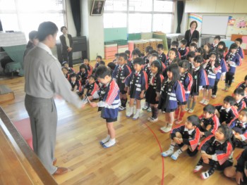 年長さんは一年間、幼年消防隊としていろいろな勉強をして『お・か・し・も』の約束も覚えました。防災センターで火災避難・地震・台風体験もしました。今日は法被を着て、「これからも火遊びを絶対にしません。」と約束をし、修了証書を頂きました。最後は100点をもらってうれしそうでした。