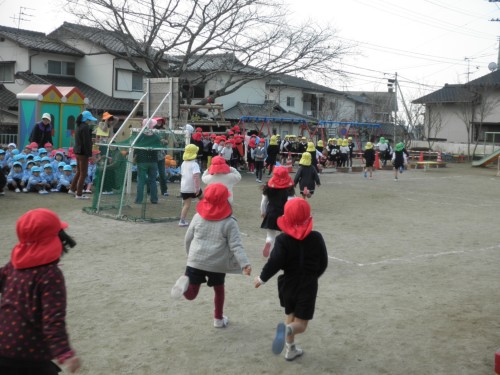 今年度、2回目の地震避難訓練を行いました。子どもたちが、いざという時に混乱せず避難できるように、学期に1度は実施しています。今回は子どもたちに事前に伝えず、自分たちで判断して行動することをねらいとしました。ベルの後、テーブルや棚等の下に隠れ、揺れがおさまったという放送の後、砂場の前に避難しました。泣く子どももおらず、緊張感を持ちながら行動することができました。園舎が倒壊することを想定し、第二駐車場まで歩く練習もしました。日頃から、いざという時に備えてご家庭でも災害時の避難の仕方や場所を一緒に確認しておきましょう。