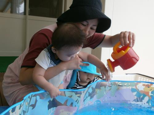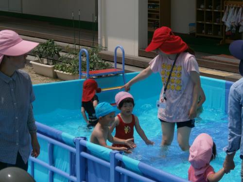 | 2歳児・・・プール広いな!楽しい~!! | 2歳児・・・先生と一緒は嬉しいな~。 |
