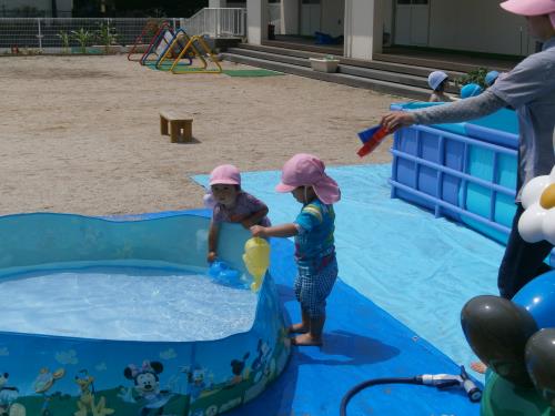 お天気のもと、戸外にみんなで集まり、プールを使用するに当たっての約束をして水遊びを楽しみました。着替えるときから大興奮のこども達は、プールに入って更に笑顔がたくさん見られました。水に触れ「きもちいい~」と感じたり、水を身体にかけながら「きゃぁ~!!」と満面の笑みが見られたり・・・降園の際には、「プール楽しかったよ」と保護者の方に話する姿も見られ、楽しさが伝わってきました。
