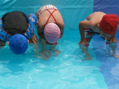 | 5歳児・・・体に水をかけてから入ります。ちょっと冷たいけど、楽しい!! | 5歳児・・・顔つけに挑戦!ドキドキしたけど頑張ったよ!! |