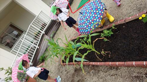 みんなで傘のさし方について話し合い、危険のないよう傘をさして雨の日の戸外へ・・・。傘に落ちる雨音を聴いたり、園庭の鉄棒やフェンス、遊具についている水滴を発見したり、草花や野菜についている水滴を指に落として遊んだり、水溜りの中に入って楽しんだりと雨ならではの遊びを楽しんでいます。