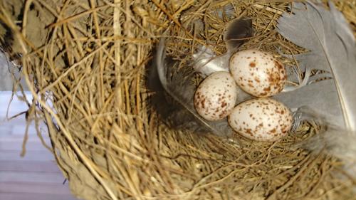 親ツバメが餌をヒナにあげている姿を観察したり、「今のお父さんツバメだ!!」と尾の長さを見て気付いたり、「とべるようになるかな?」と、気にかけるこども達の姿はまるで親鳥のようです。これからの成長が楽しみです。  |  | ツバメの卵です。約15日でヒナにかえりました。 | 無事に3羽のヒナが産まれました!! |