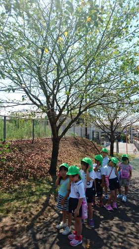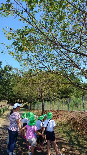 毎日暑い日が続きますが、朝夕は少しずつ涼しくなり過ごしやすくなってきたなと感じています。こども達に話をすると、「うん、涼しくなってきた!!」との声が聞かれたり、登園時に緑色の¨ドングリ¨を枝つきで持ってきてくれたりと、少しずつ秋を感じるようになってきています。