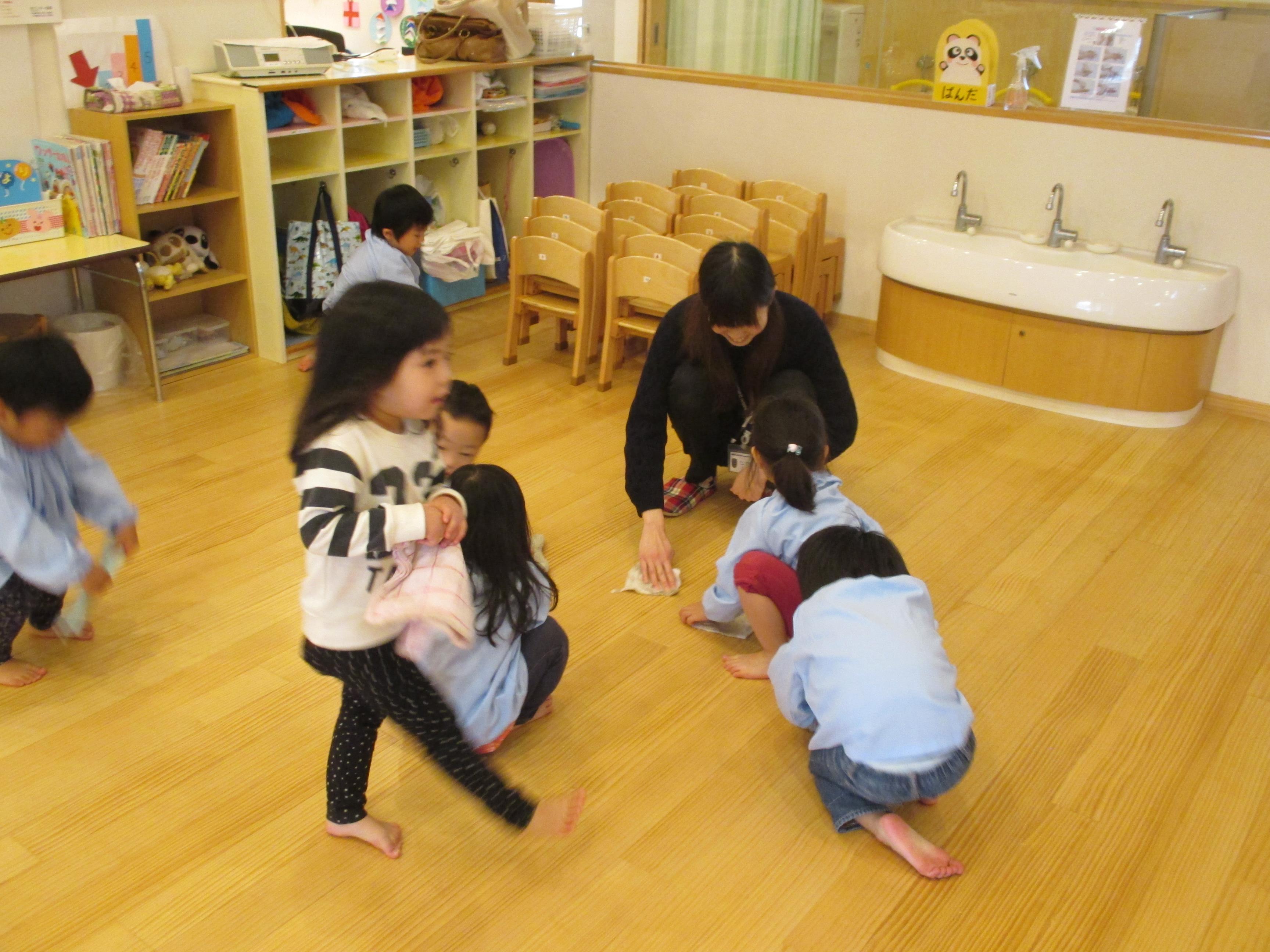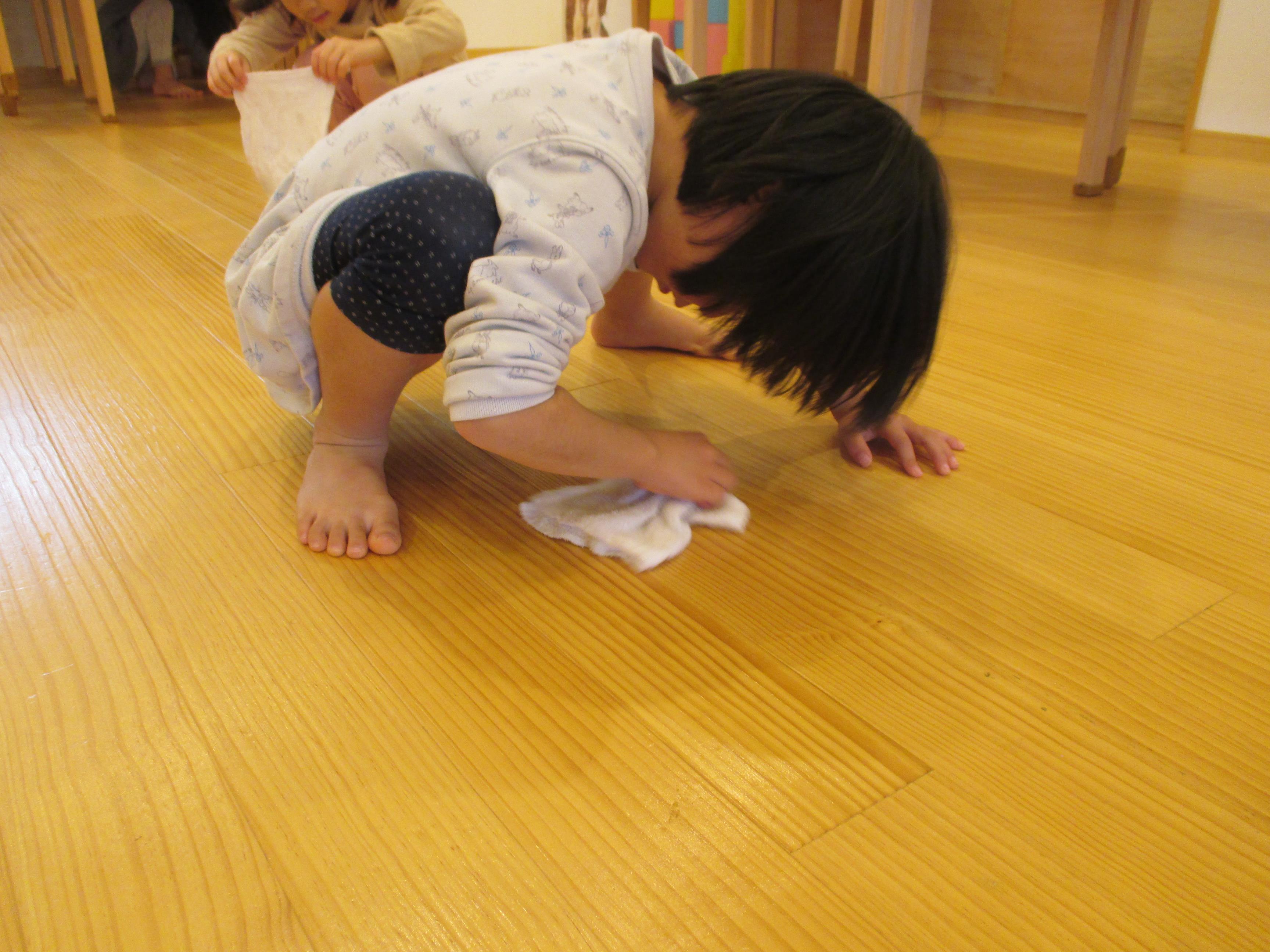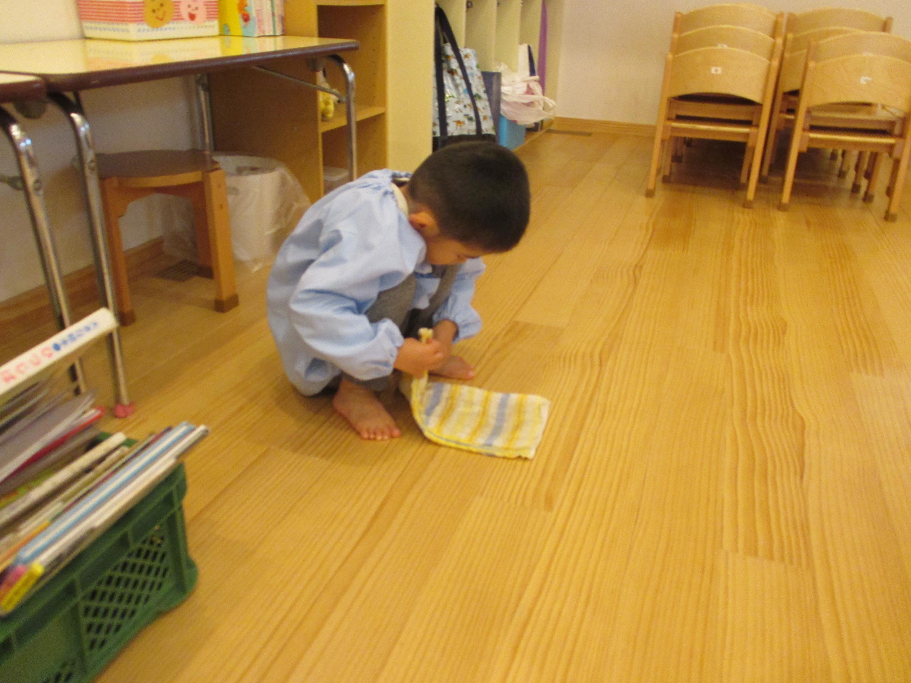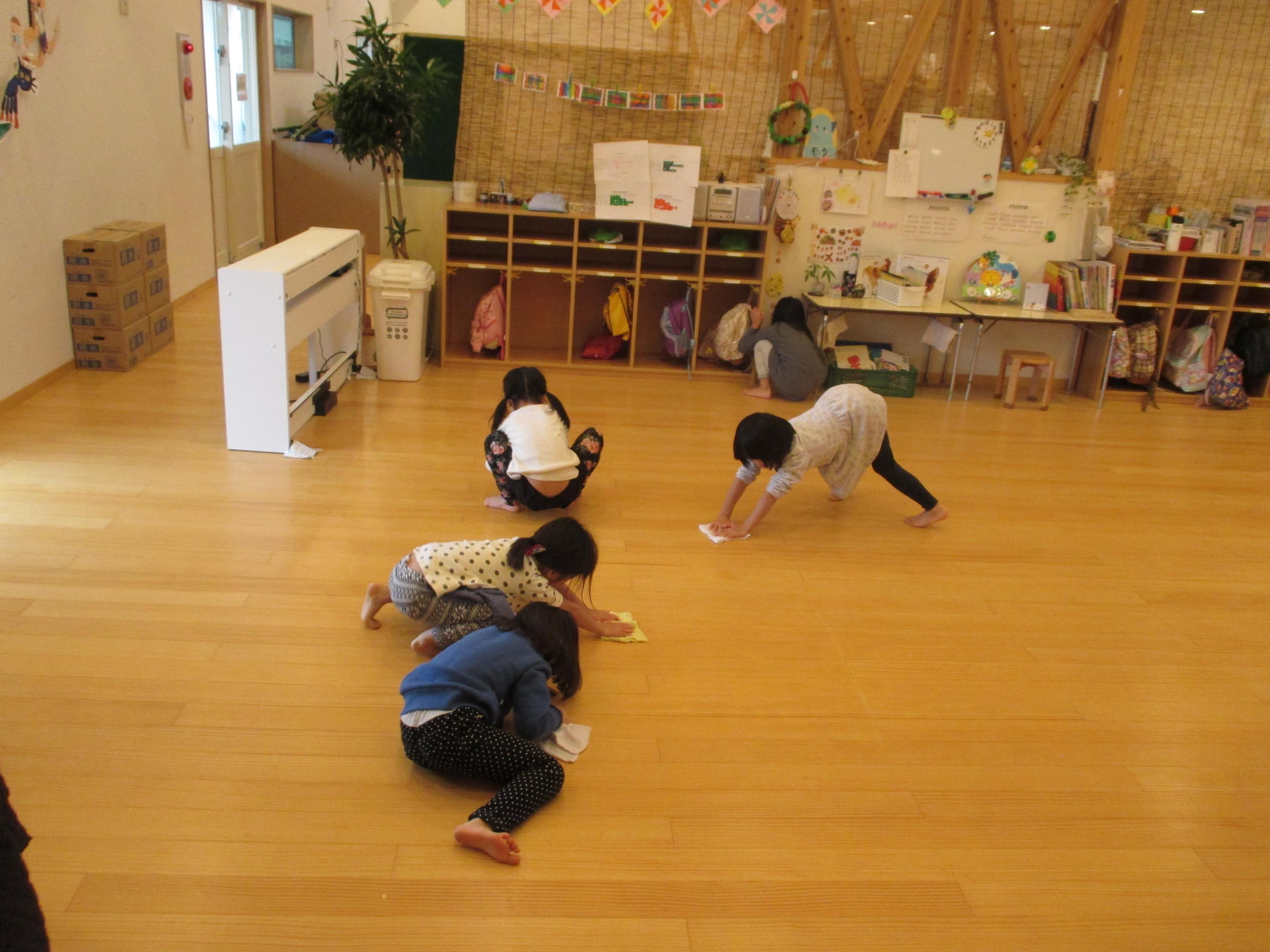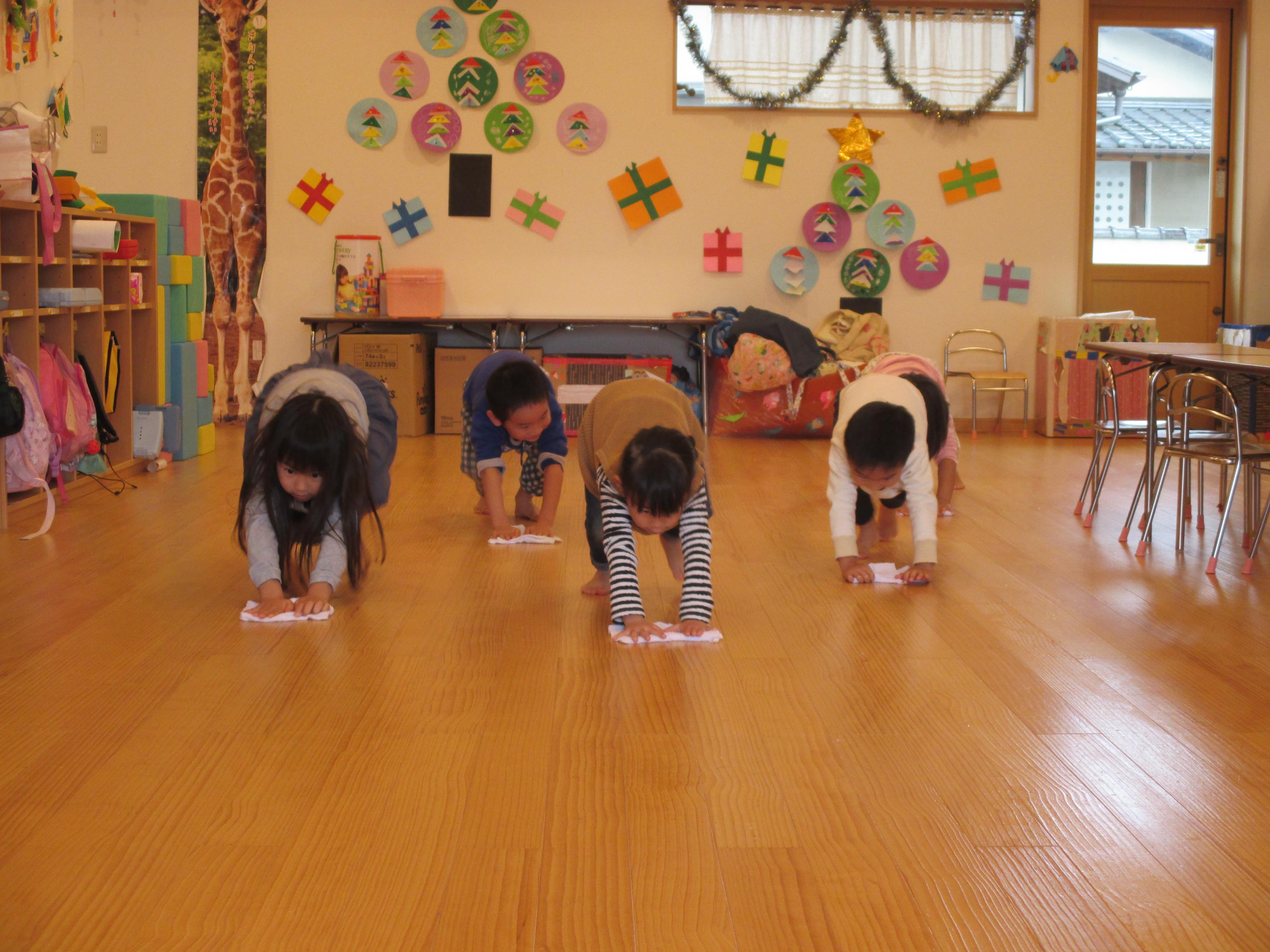 年少から年長と取り組み方もそれぞれでした。こども達の真剣な取り組みを見ると、「任せられると発揮したい」という意欲につながり、経験の大切さを感じます。ご家庭でもどこかひとつ担当を決められて、取り組んでみてはいかがでしょう? 驚くほどしっかりした様子を見ること間違い無しです。 3歳児ぱんだ組さんは一人ひとり雑巾を持ち、いす置き場や、棚の中、床拭きと張り切って掃除しました。中には「ここが汚れている」と真剣にこすって綺麗にしたいという、思いが姿に溢れていました。雑巾についたゴミや砂は、ゴミ箱の中に落とす様子も見られました。靴箱を拭いたり、普段やらないことはわくわくするようです。  |  |  | | 「次はどこをきれいにしようかな」 | 「雑巾をたたんで使うんだよ」 | 「ここがよごれてる!!」 「わたしが綺麗にするからね」 |