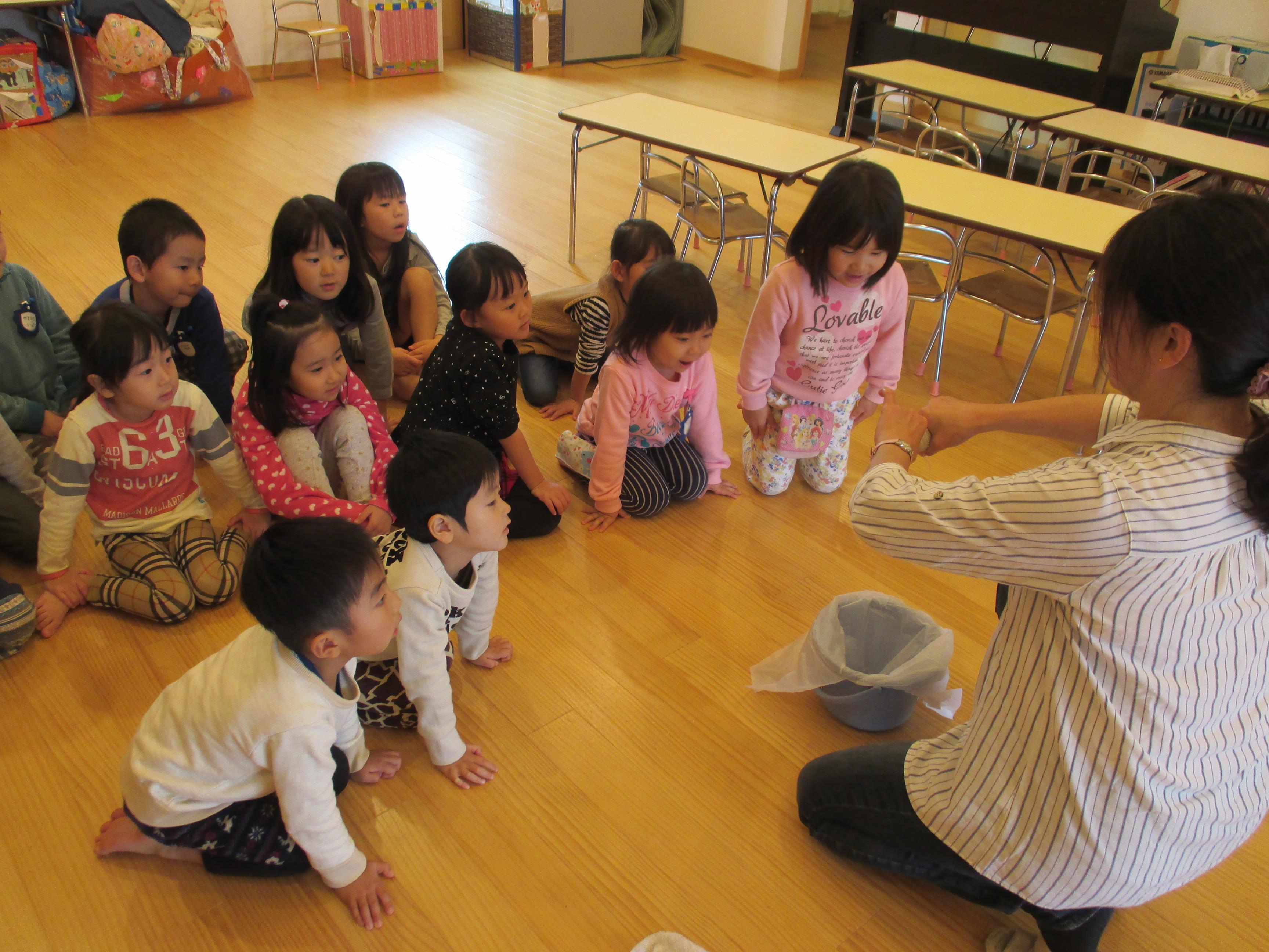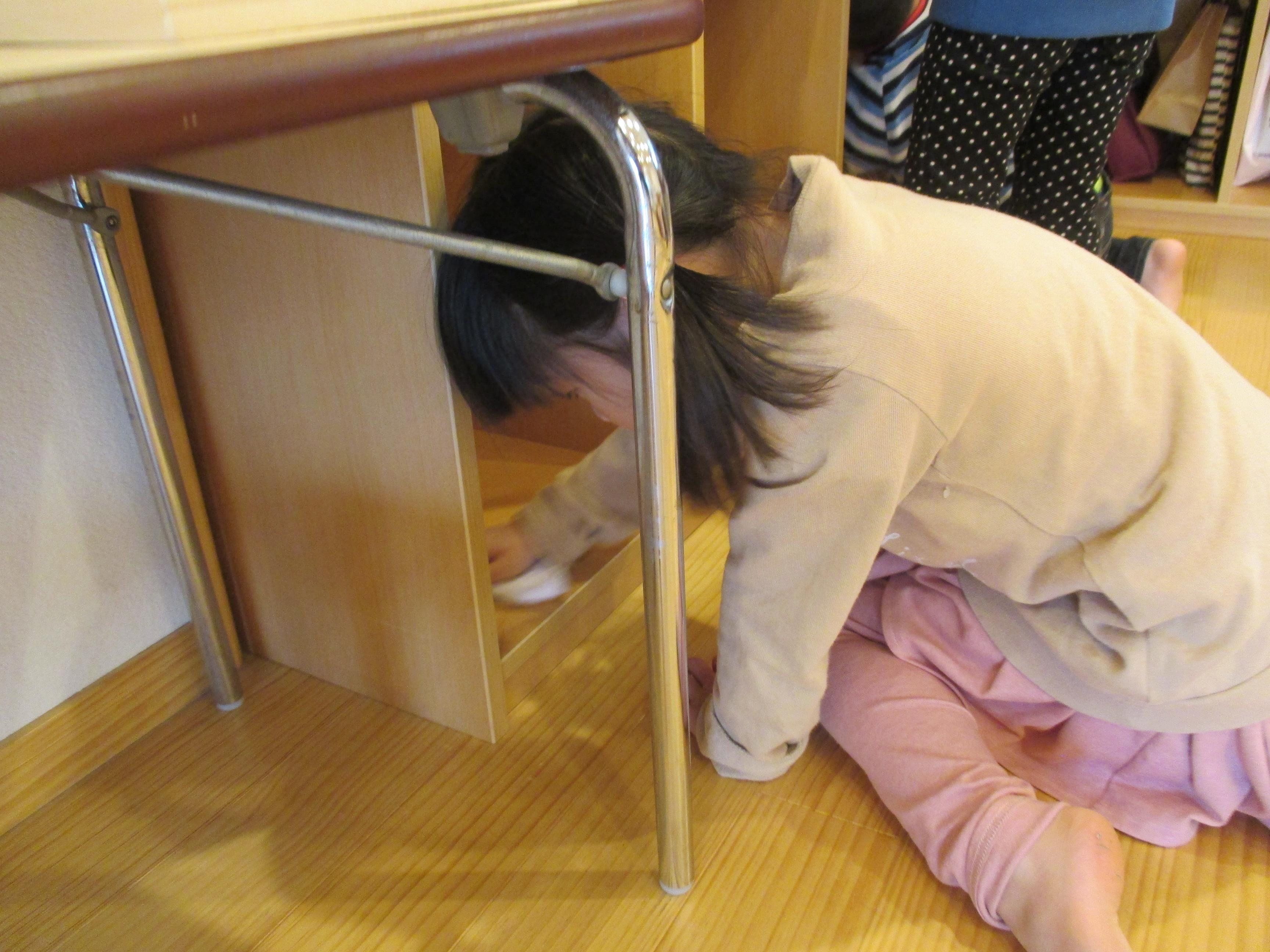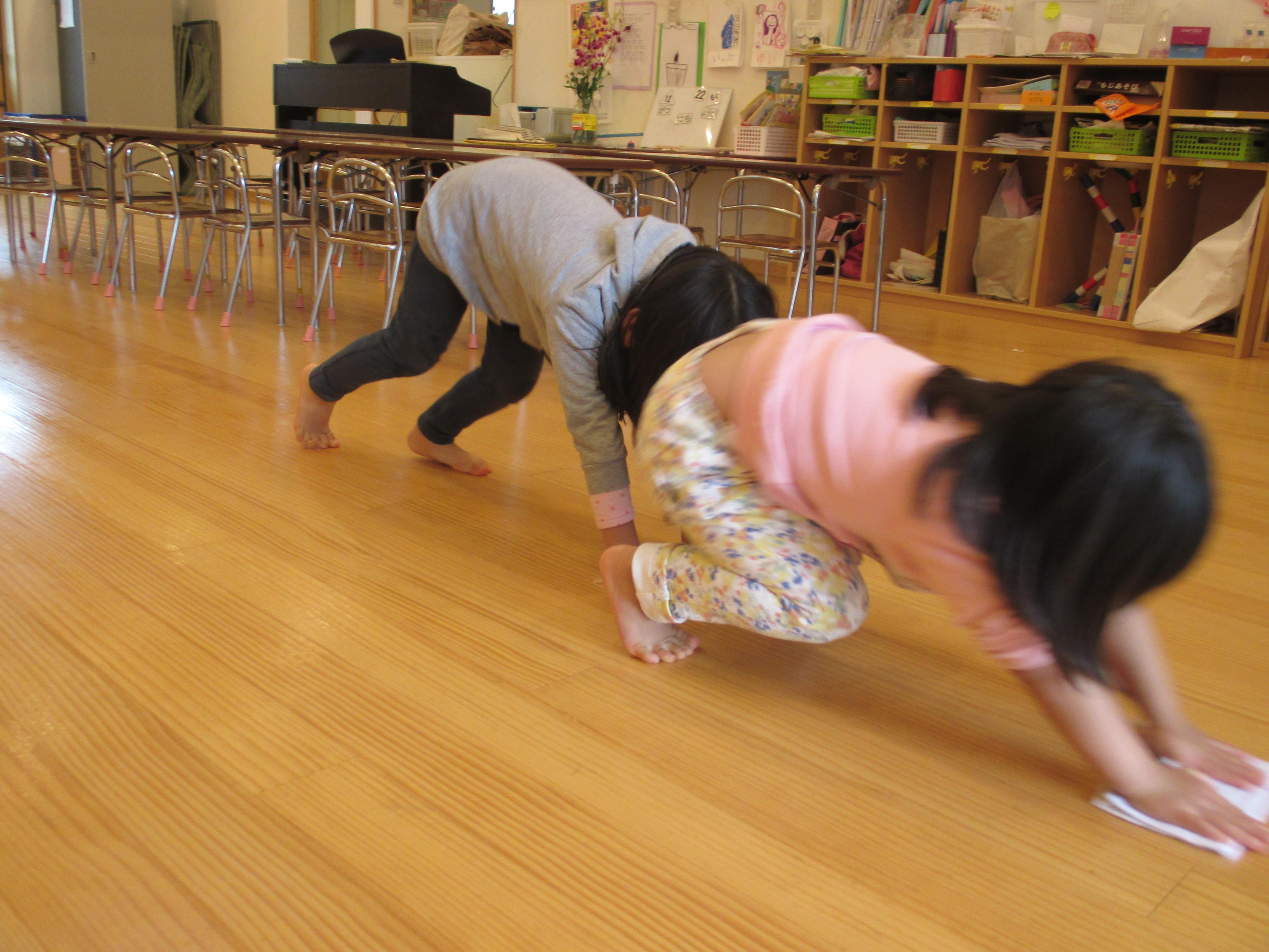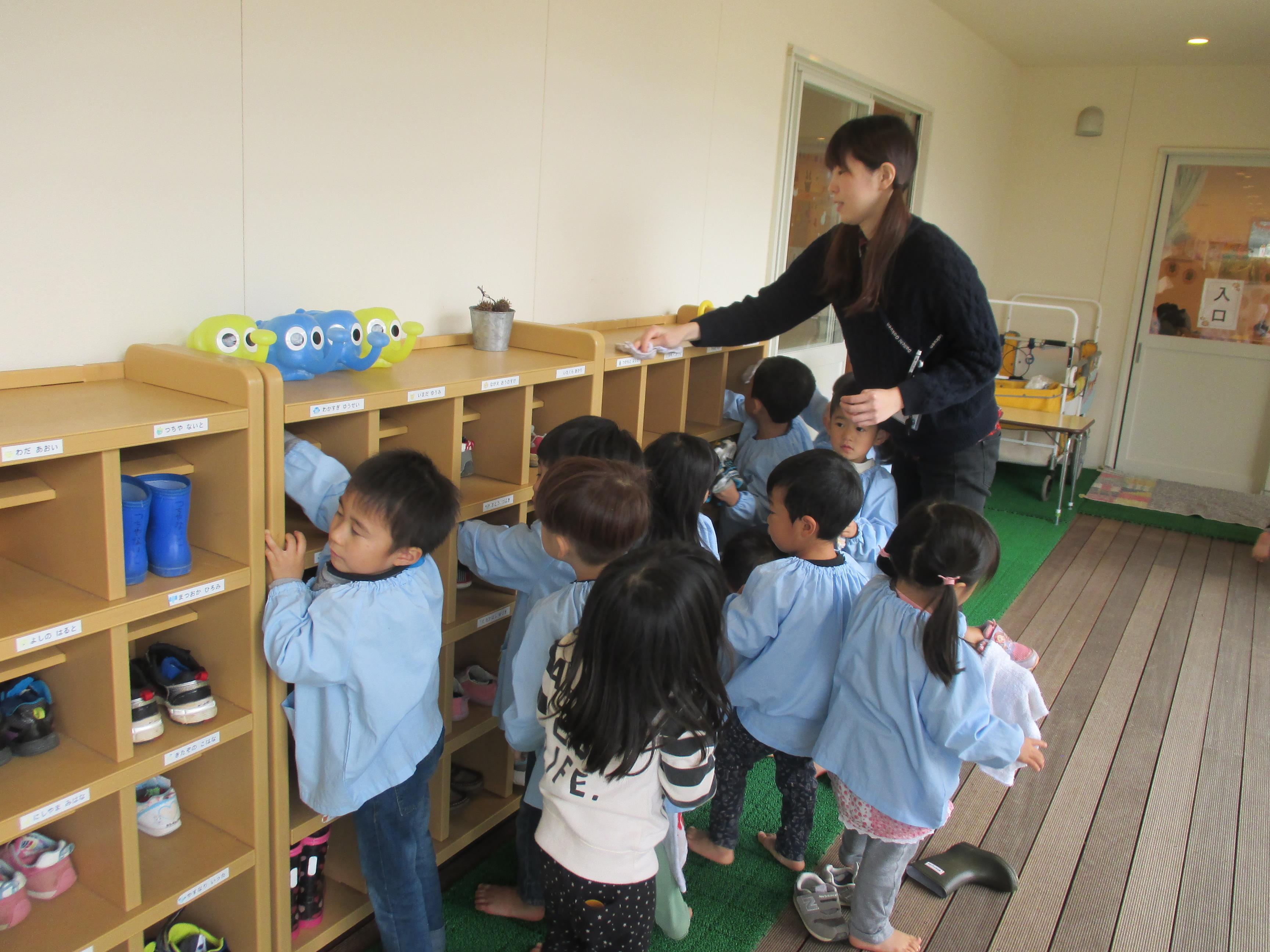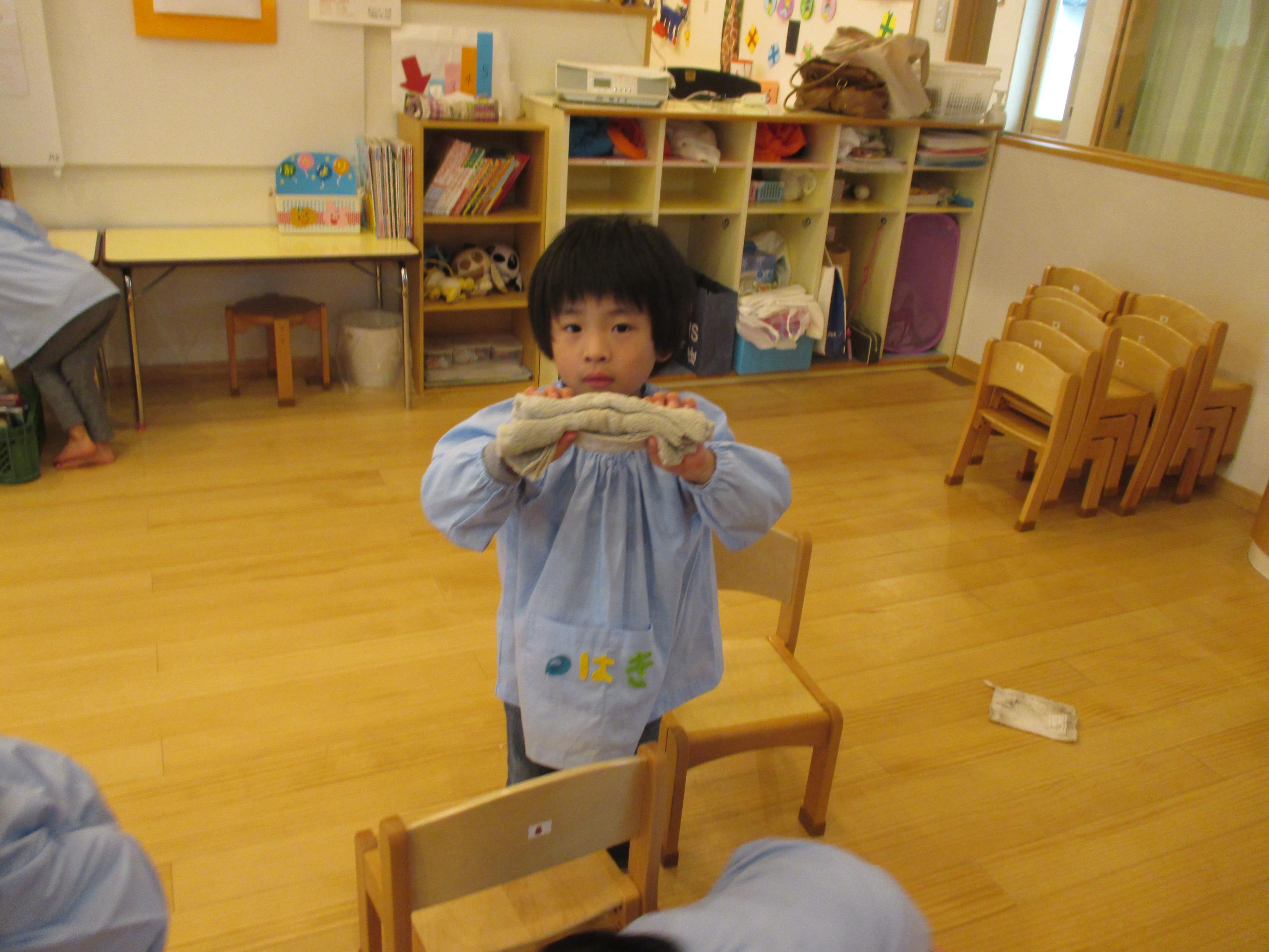 年少から年長と取り組み方もそれぞれでした。こども達の真剣な取り組みを見ると、「任せられると発揮したい」という意欲につながり、経験の大切さを感じます。ご家庭でもどこかひとつ担当を決められて、取り組んでみてはいかがでしょう? 驚くほどしっかりした様子を見ること間違い無しです。 3歳児ぱんだ組さんは一人ひとり雑巾を持ち、いす置き場や、棚の中、床拭きと張り切って掃除しました。中には「ここが汚れている」と真剣にこすって綺麗にしたいという、思いが姿に溢れていました。雑巾についたゴミや砂は、ゴミ箱の中に落とす様子も見られました。靴箱を拭いたり、普段やらないことはわくわくするようです。  |  |  | | 「次はどこをきれいにしようかな」 | 「雑巾をたたんで使うんだよ」 | 「ここがよごれてる!!」 「わたしが綺麗にするからね」 |