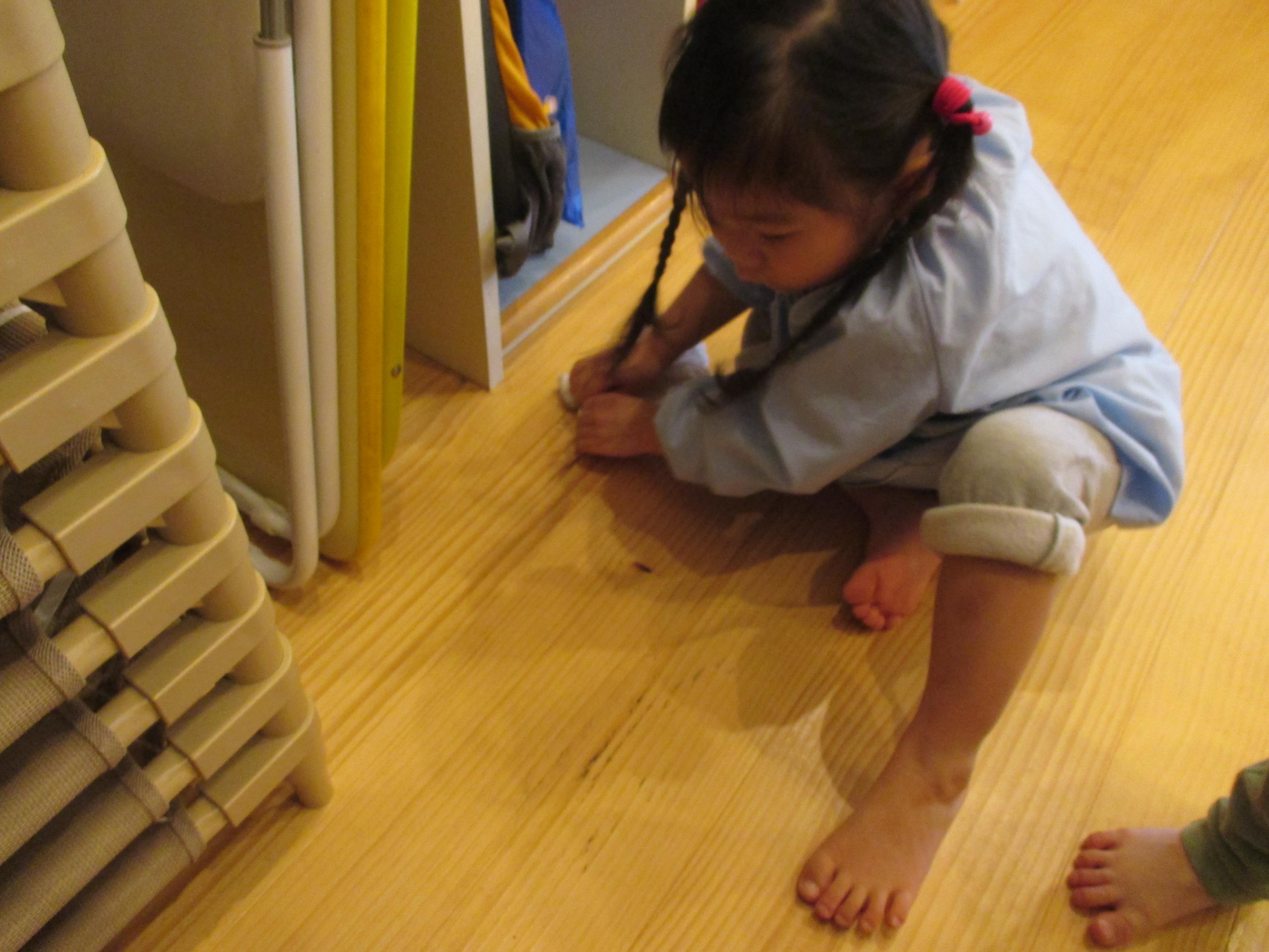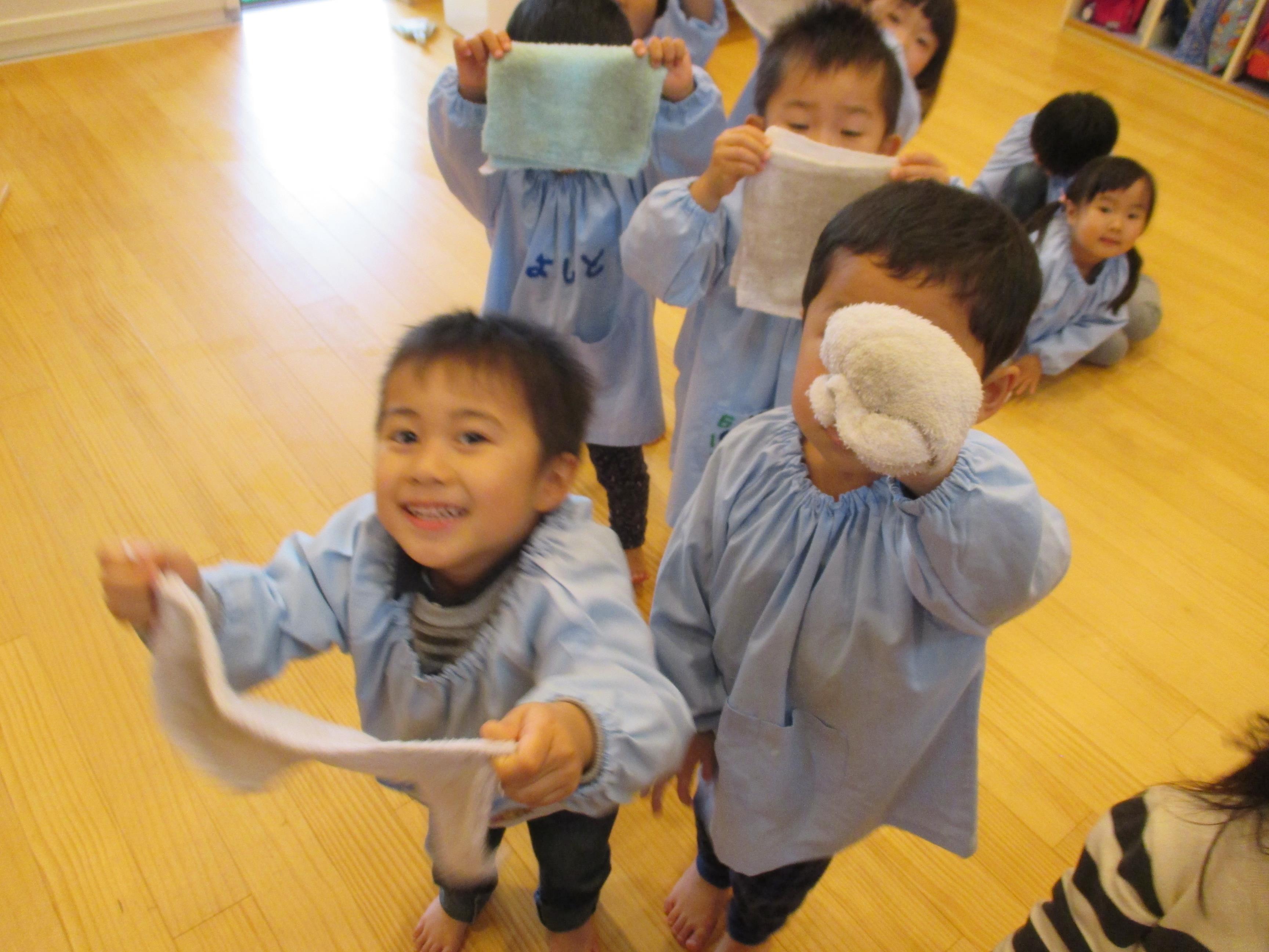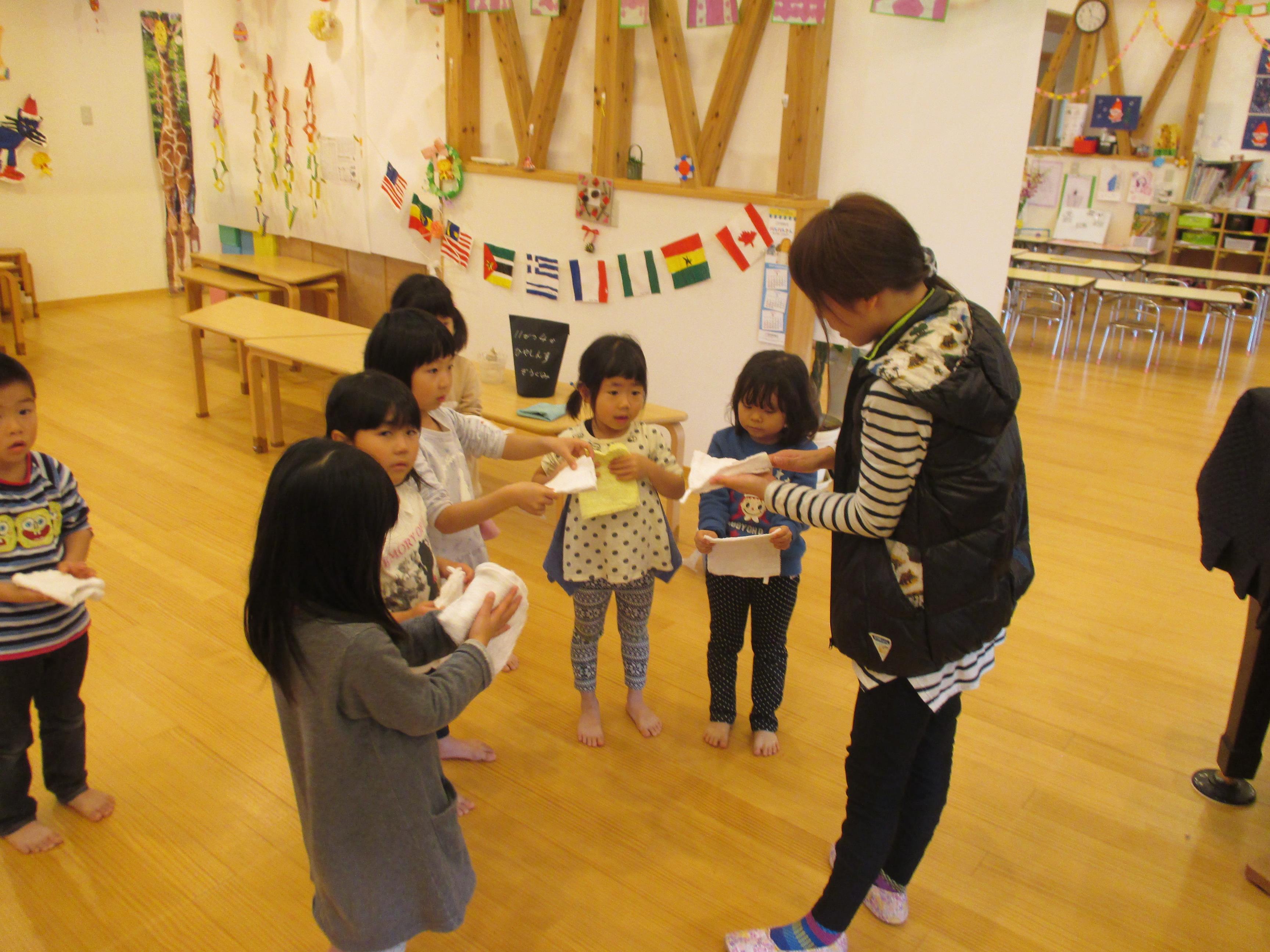 4歳児きりん組さんは、「雑巾の絞り方」を先生の実演を見ながらチャレンジしました。互いの手をねじることで、水を絞れることを再確認したようです。今後の当番活動に活かされると思います。 早速、汽車拭きで部屋中あちこち拭いては「こんなに汚れていたんだね」と驚いていました。濡れた床に足を取られることもまた楽しさを倍増し、「わあーすべる」「あっ」ところころ転がっては笑いが響いていました。