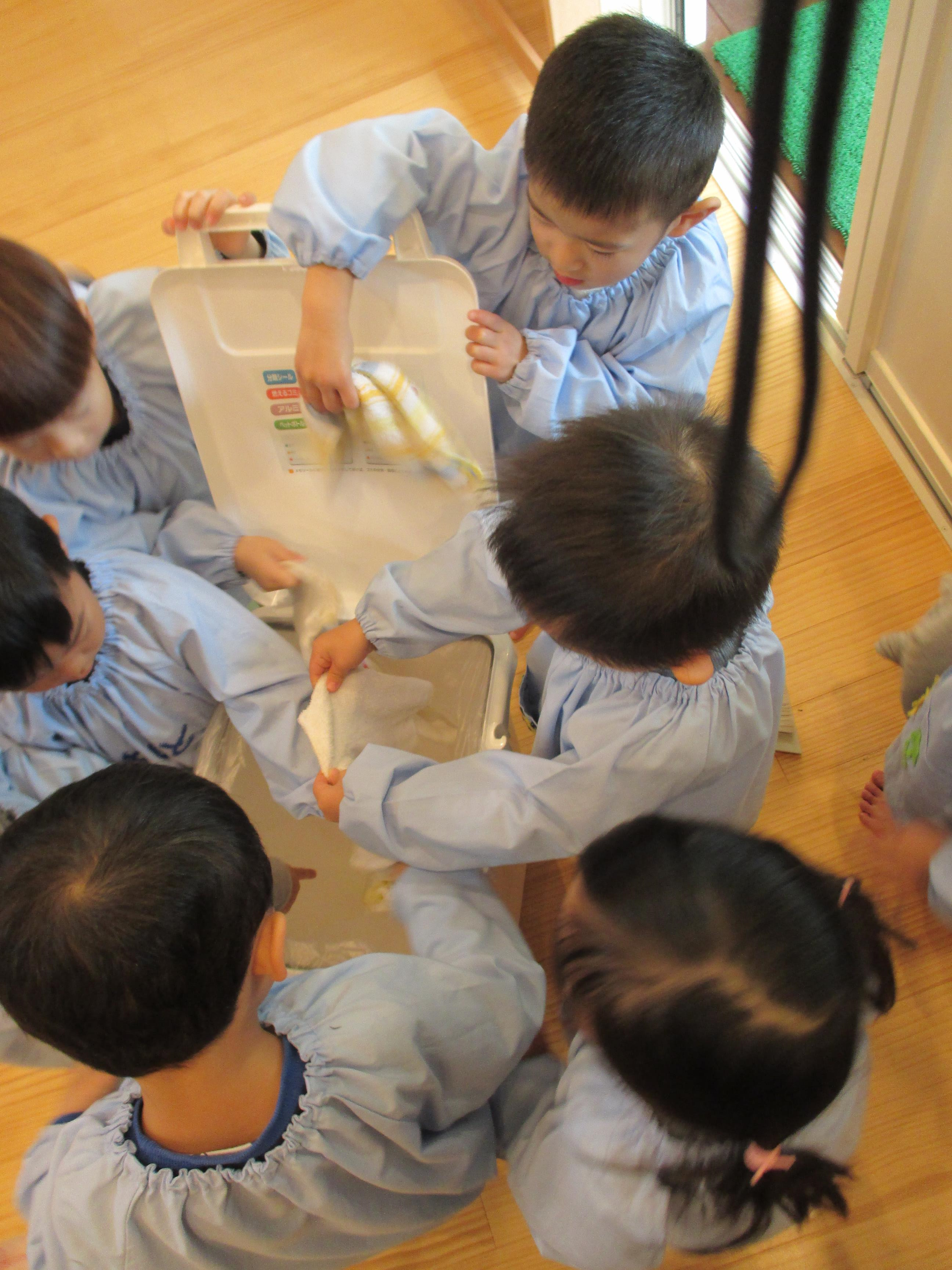 |  |  | 雑巾に付いた砂は・・・ ゴミ箱にいれよう!! | ぬらす前にみんなで絞り方の確認をしたよ | 「ぎゅーってやったら、お顔まで力が入っちゃった」 |