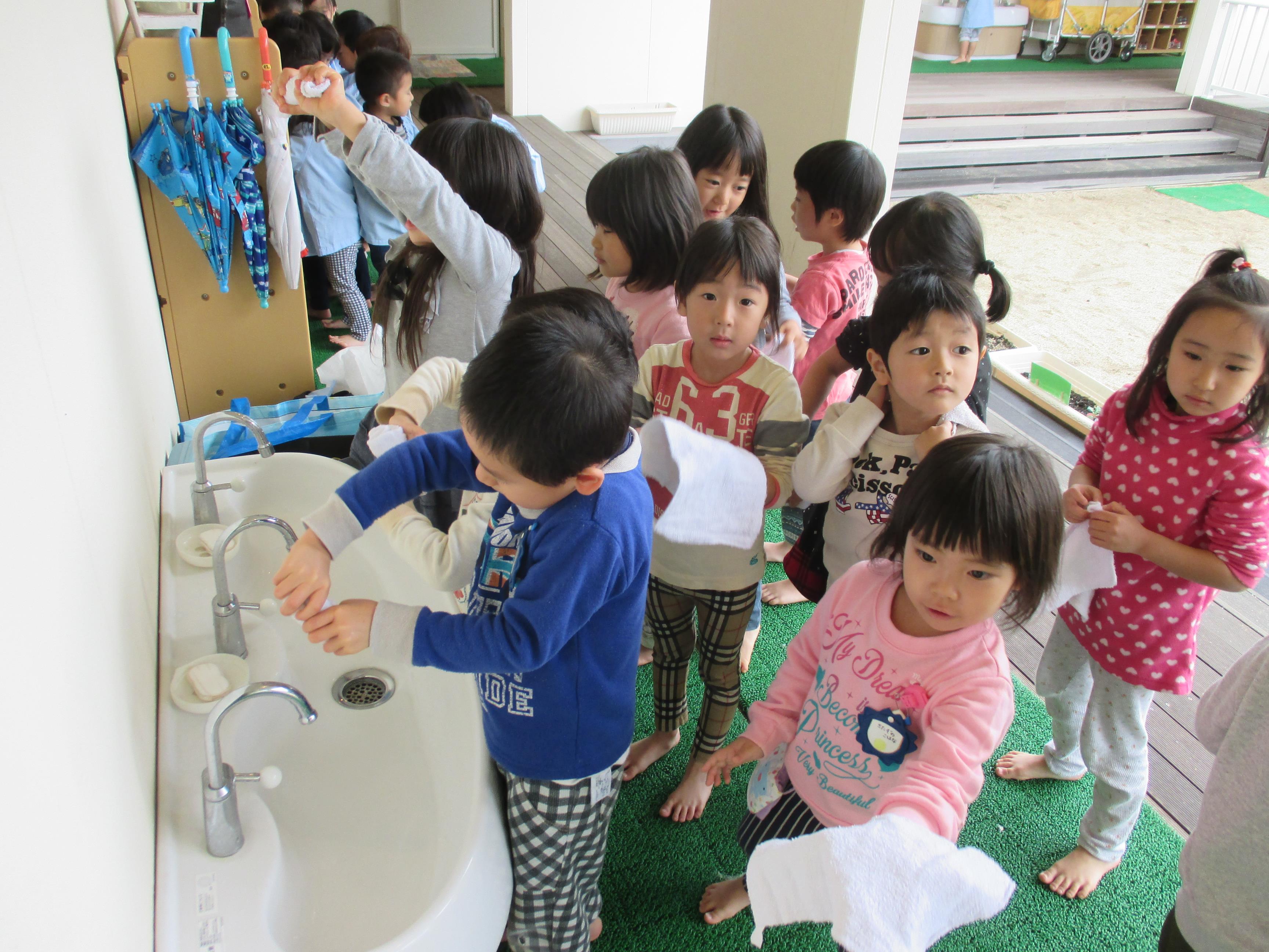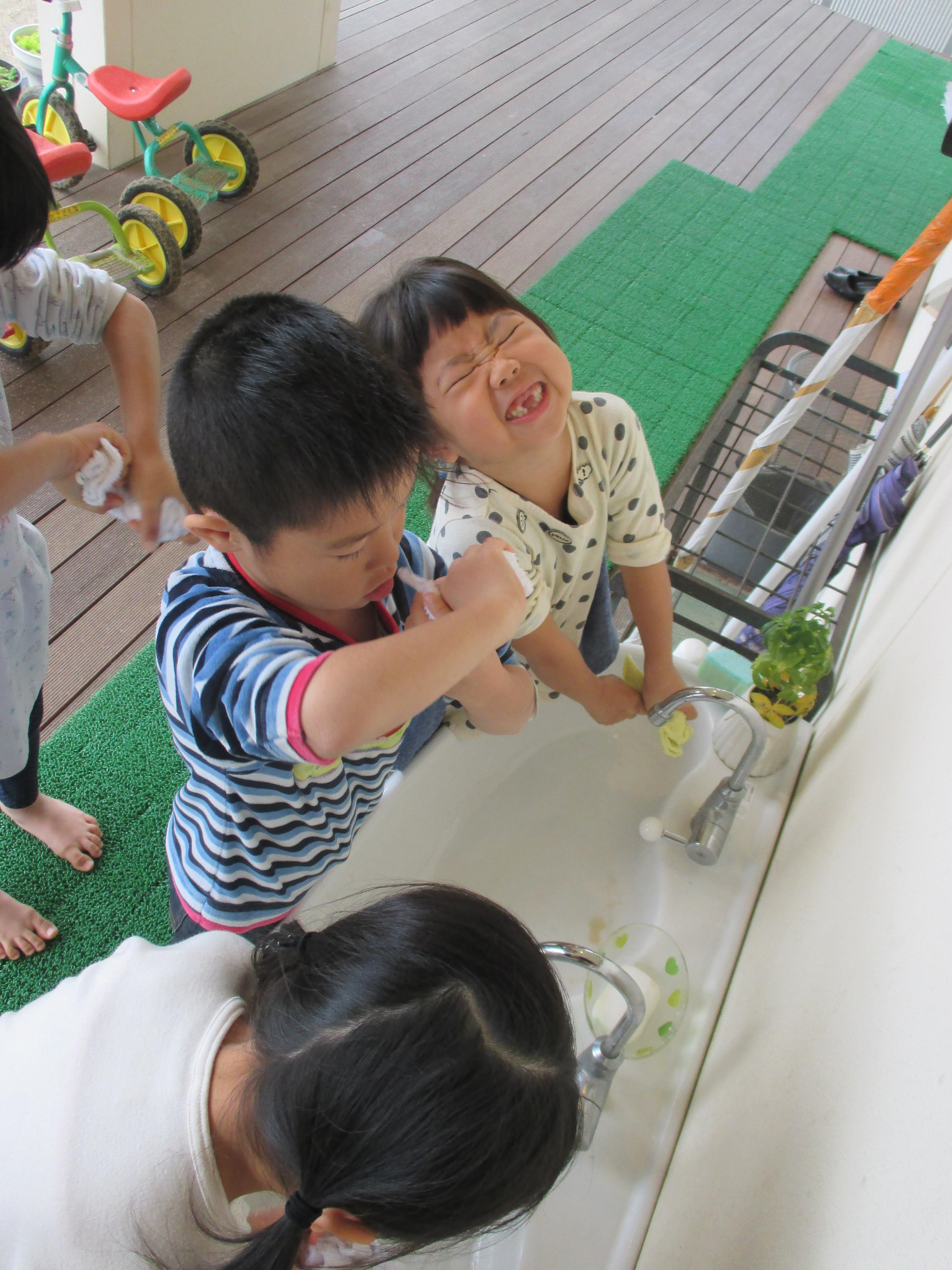 |  |  | | どのくらい力を入れると水が出なくなるか?先生がやって見せてくれました | 「よーし。ぎゅーとしぼるぞ」 | 汽車拭き。おもしろーい。 でも、足がすべるよ。 |