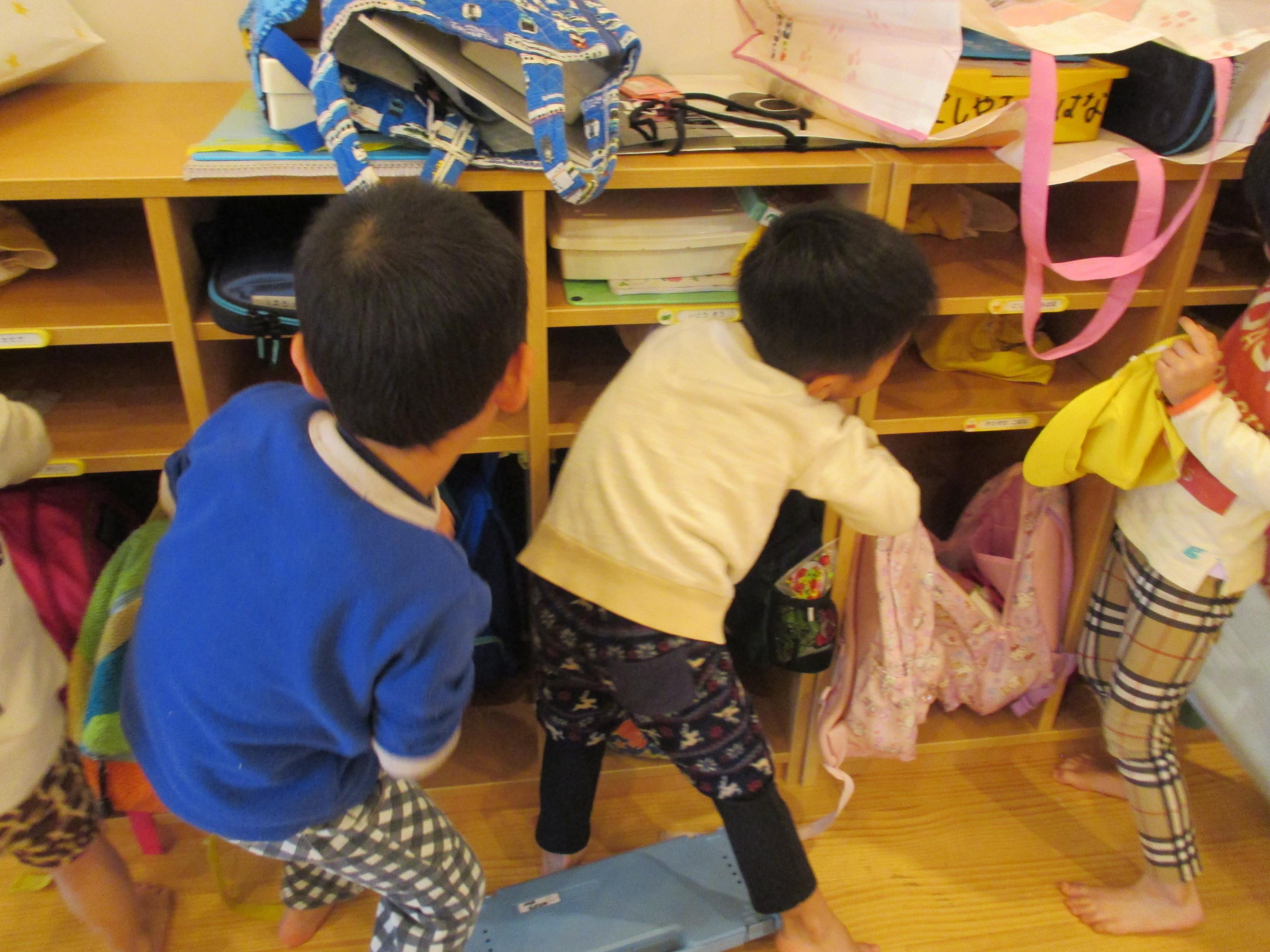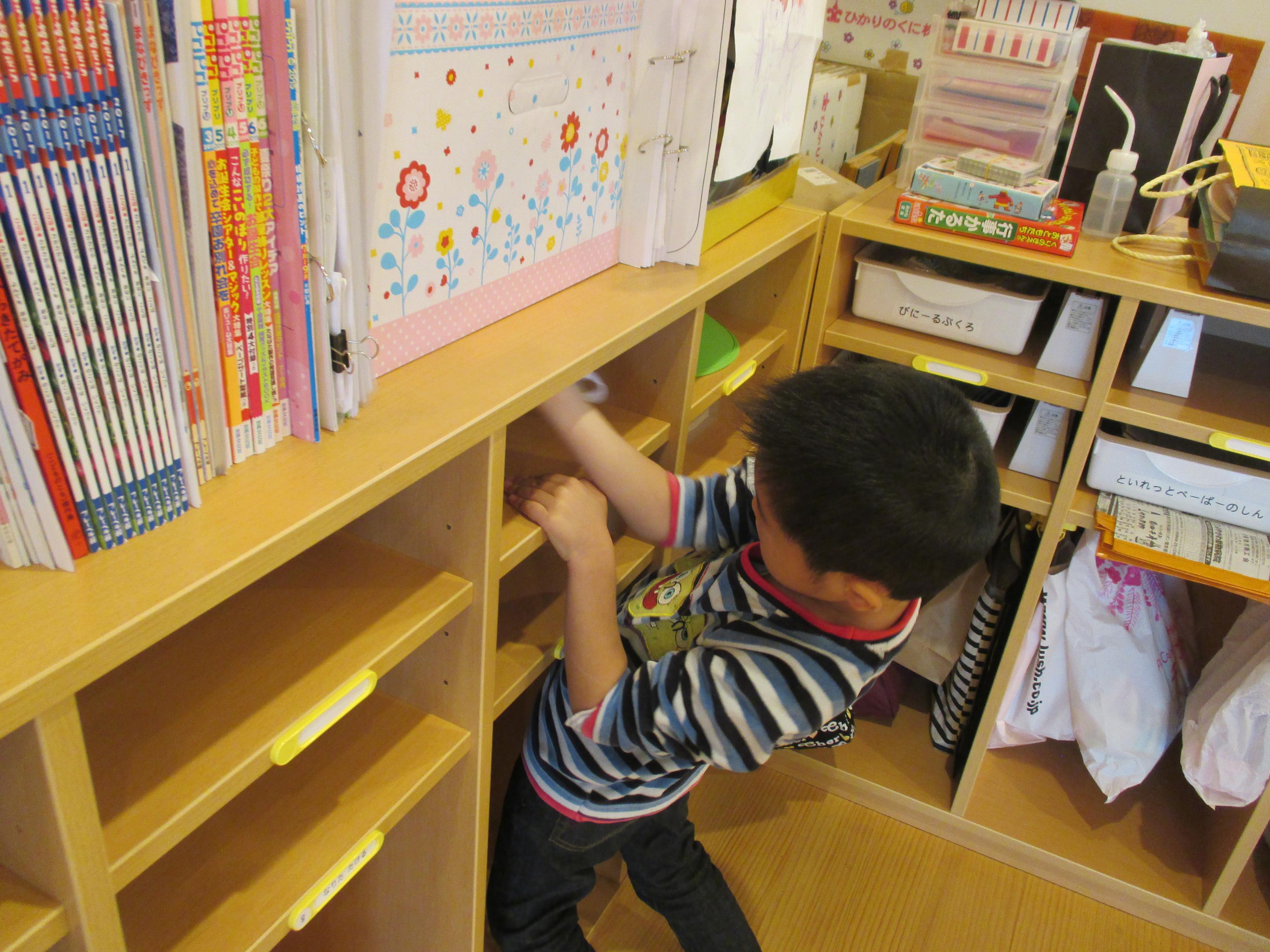 5歳児ぞう組さんは、「雑巾をどのように使って綺麗にするか」「ぎゅーっと力を入れる」を話し合って取り組みました。狭いところは雑巾の端を使ったり、棚の上も綺麗にしたり、汚れた面を返しながら拭いていく。と一人ひとりが考えて掃除をしました。「この汚れはとれるかな?」相談する姿もあったり、お休みのお友だちの棚を「ぼく、棚拭き3つ目」と人を思いやる姿もありました。  |  |  | | 棚は、上も拭かないとね | 綺麗にする所をしっかり見ながらふきました | 「これ取れるかな?やってみよう・・やった。だんだんとれてきたよ」 |