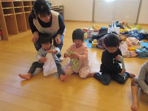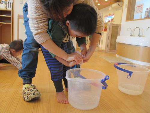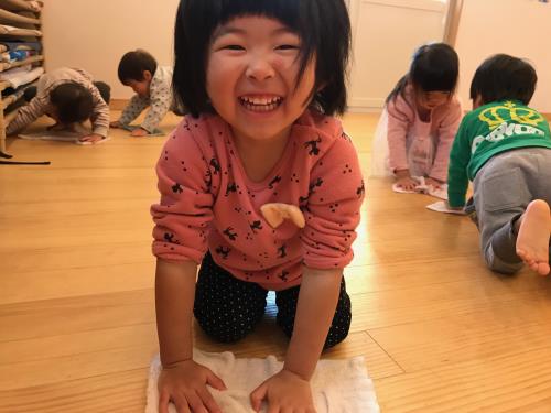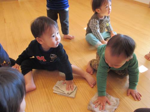 |  |  | | 濡らす前に「ぎゅー」の練習です。左右違うほうに力を入れるって難しいよ。 | 実際に水で濡らして絞りに挑戦。「ぎゅーってむずかしい」でも先生も手伝ってくれたよ。 | 両手で体を支えながら、拭く様子が見られます。 年齢による取り組む様子の違いが伺えます。 |
