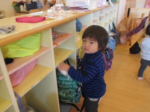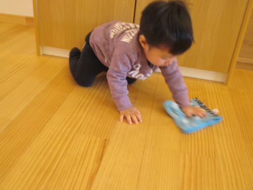 |  |  | みてみて!汚れてくる雑巾を確認していました。 | 雑巾を配られるとすぐ、手つき良く拭き始めました。 力も入っています。 | 棚も綺麗にしなくっちゃ! 自発的に棚を拭き始め、びっくりしました。 |