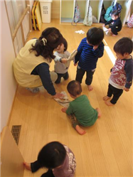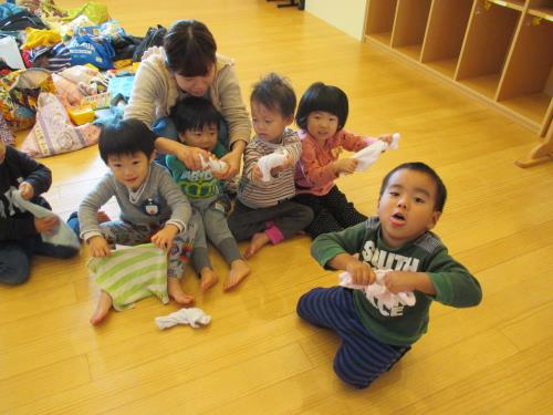 |  |  | | 体を支えて拭く姿は、とっても上手でした。きっとご家庭での経験が生かせれているのでしょう。 | 2歳児 みんなで絞り方・拭きかたを聞きました。身をのりだして、意欲満々です。 | まず、雑巾を畳んで・・っと 一つ一つ真剣です。 |
