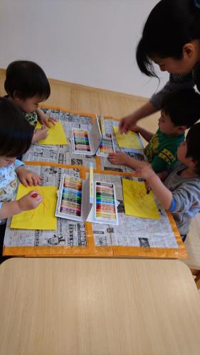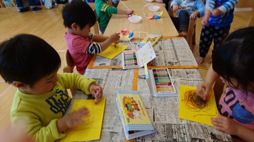 進級して初めての制作を行いました。今回は、クレパスを使っての制作です。グルグル腕を回して決められた紙の中に描くことを意識しながら描きました。先生の話にも耳を傾け、しっかりと聞くことができました。 クレパスの使い方(出し方・握り方・片付け方)を聞き、実際に使ってみました。何色にしようかな・・・と考えて選んだり、先生の声かけで持ち方にも気をつけたり、画用紙の中から出ないようにう描いたり、グルグルを意識して描く姿も見られました。 描き終わったこどもは、ひも通しをして待ちました。初めてのひも通しでしたが、穴をみつけ、一生懸命通そうと挑戦していました。 これから、色々な経験をして、心も身体も成長していってくれたらと思います。  |  |  | | クレパスの握り方も教えてもらうよ!! | 「色を重ねるとおもしろいね」 | ひも通しは穴に通すの難しいけど、頑張るぞ!! |