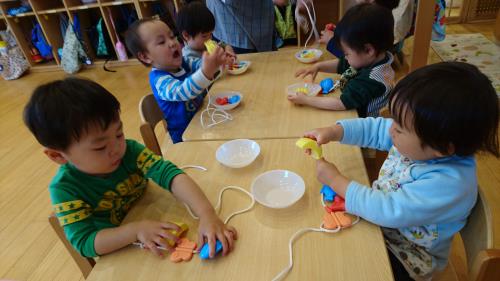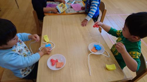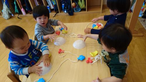 |  | | | 通したら並べてみよう♪ | お皿をひっくり返して出る音に気付き、楽しんでいます。「僕もやってみよう」・・・友だちの姿を真似してみると、なんだか楽しいな!! | |