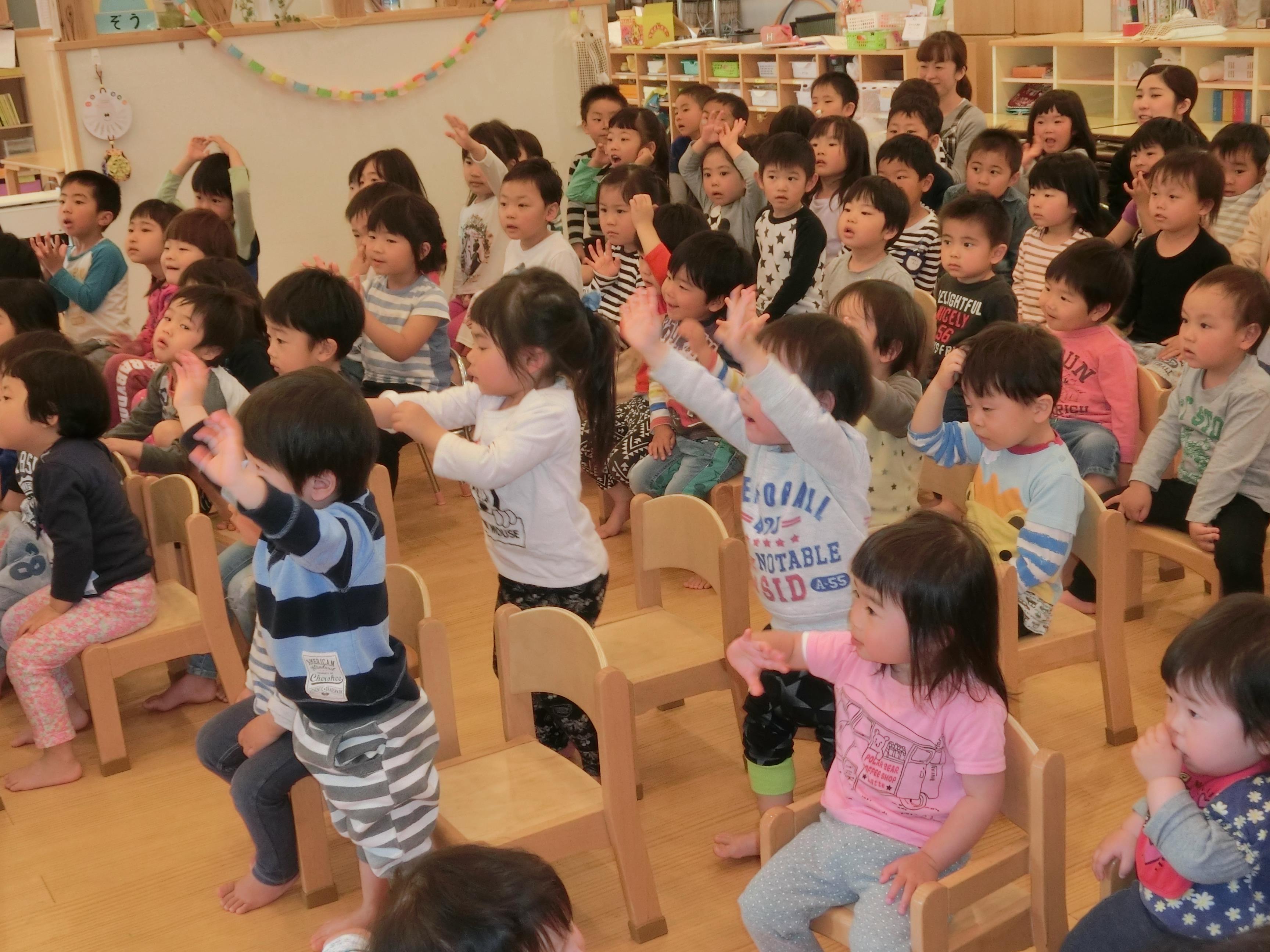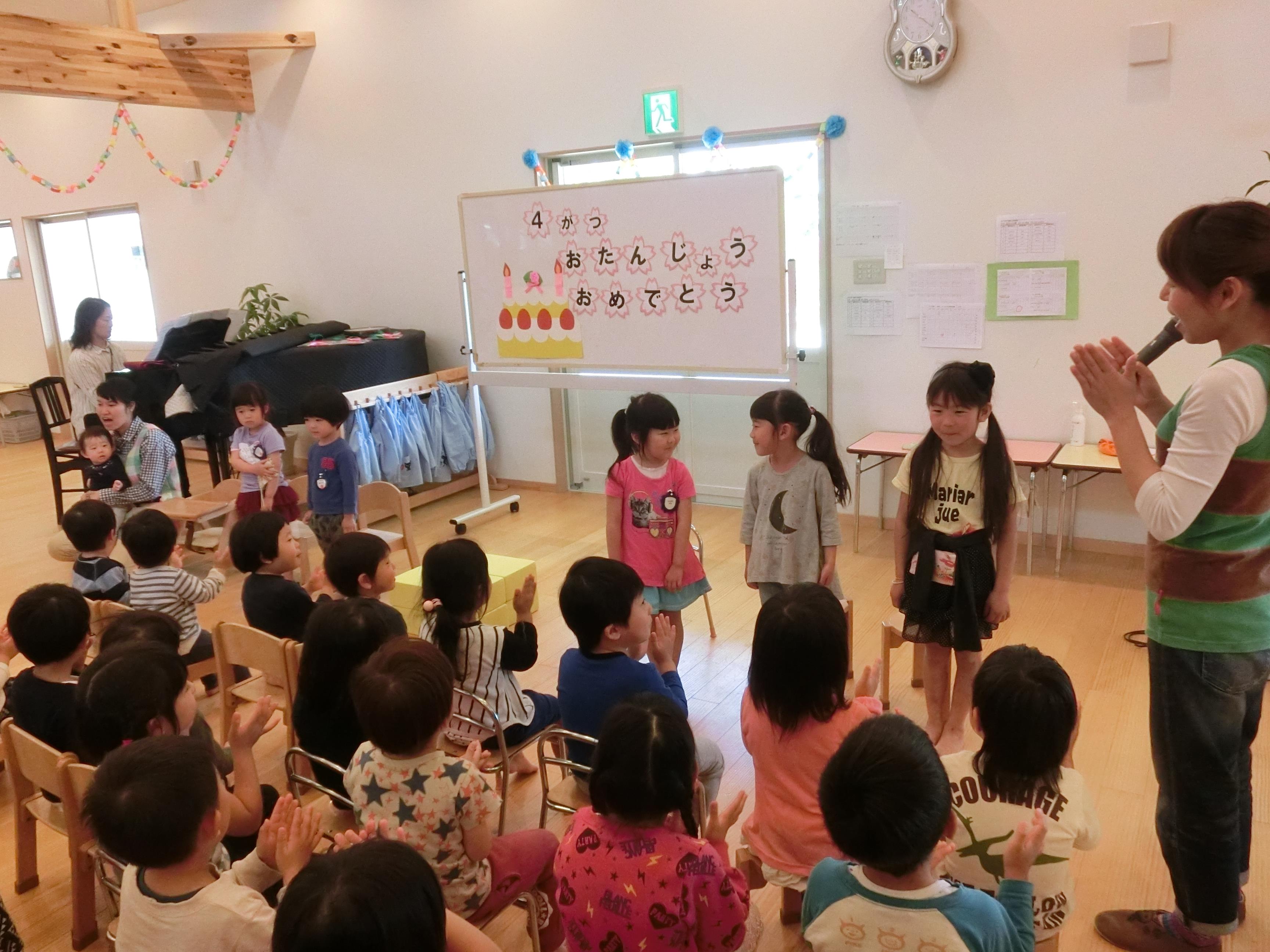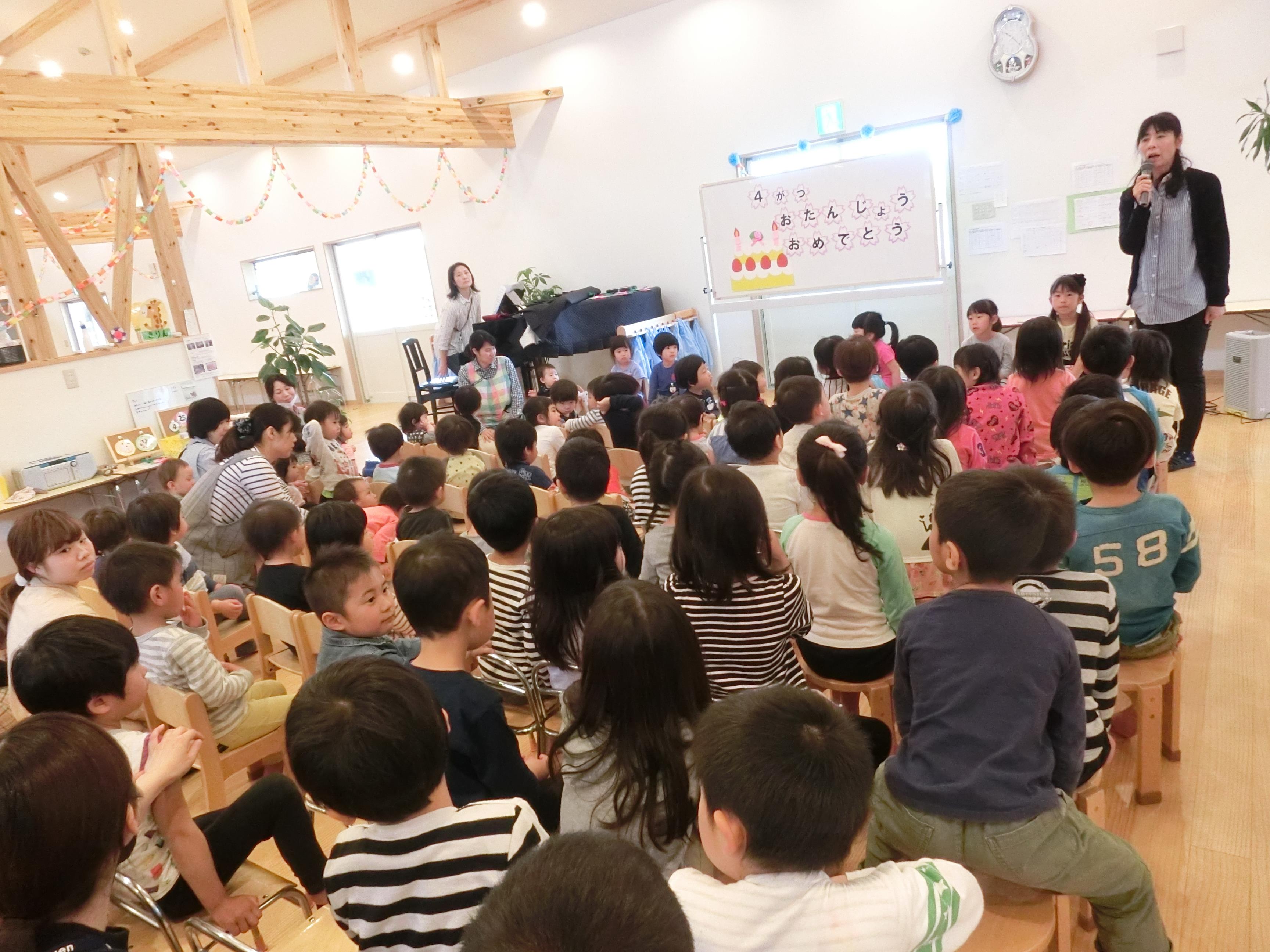 H29年度はじめての誕生会が行われました。 昨年より人数が増えて、お祝いするこども達で誕生会会場は一杯となりました。4月生まれのお友だちは、今年から取り入れた積み木のステージに立ち、ドキドキしながらもはっきりとした声で、自己紹介が出来ていました。頑張る友だちの様子を見守り、自分の発表に思いをはせている表情は期待に胸膨らませていました。 年長児は自分で選んだ歌を披露し、「どうして選んだのか?」「どこを気をつけて発表するか」を自分の言葉で伝えます。 年中児は名前と誕生日、年齢、好きな遊びを発表します。4月生まれのきりん組さんは新入児さんでしたが、はきはきと発表できていました。 年少さんは、名前、年齢を伝え、「好きな食べ物はなんですか」の問いかけに「~です」と丁寧に答えていました。自分の言葉で伝える経験を通して、これから人前での発表に自信をもって取り組んで欲しいと考えています。  |  | みんなの拍手の中、誕生児の入場です。 ハッピーバースデー♪の歌のプレゼントをしました。 | 園長先生の話を聞いて、ひとつ お兄さん、お姉さんになることにわくわくしました。 |