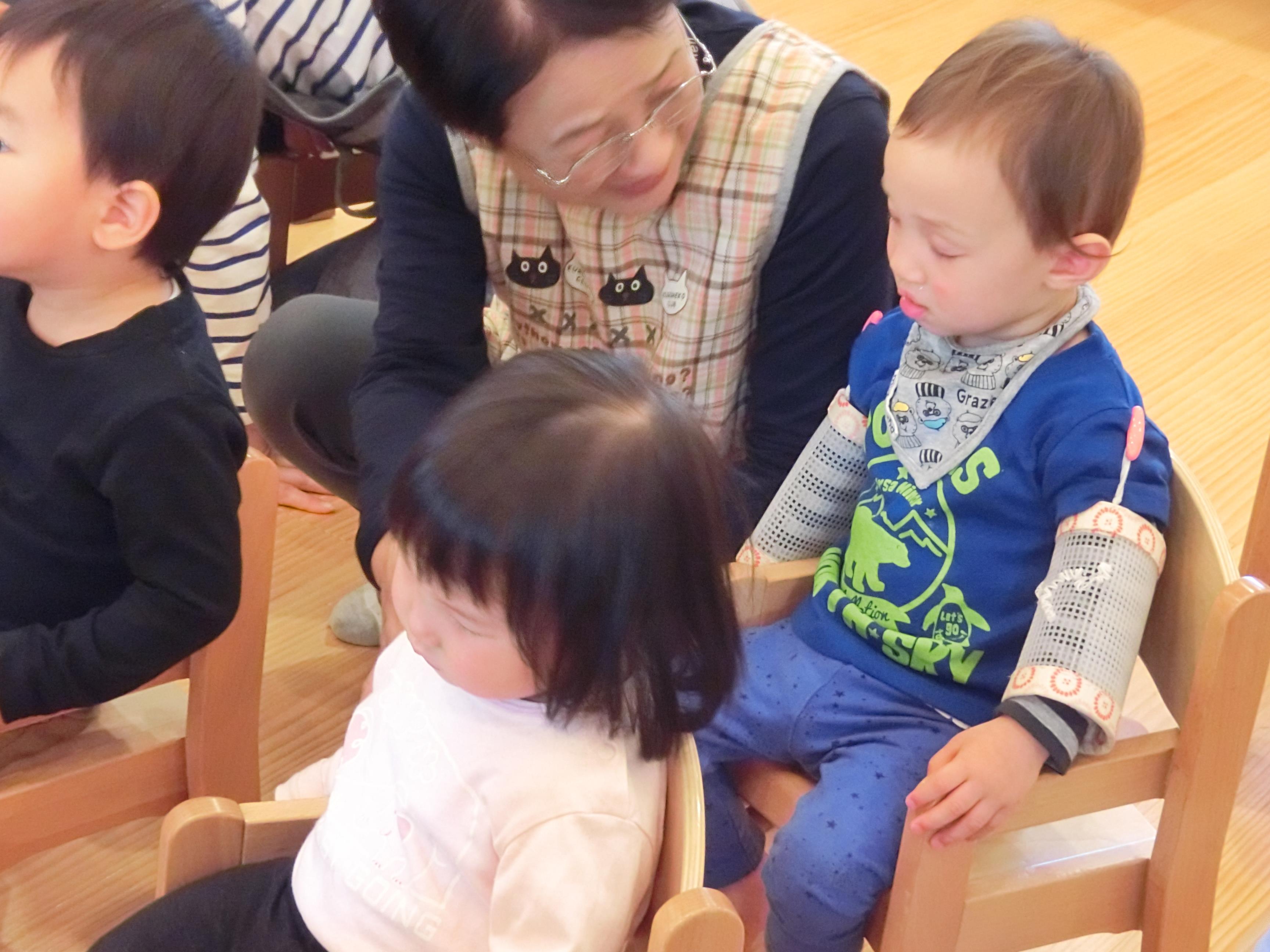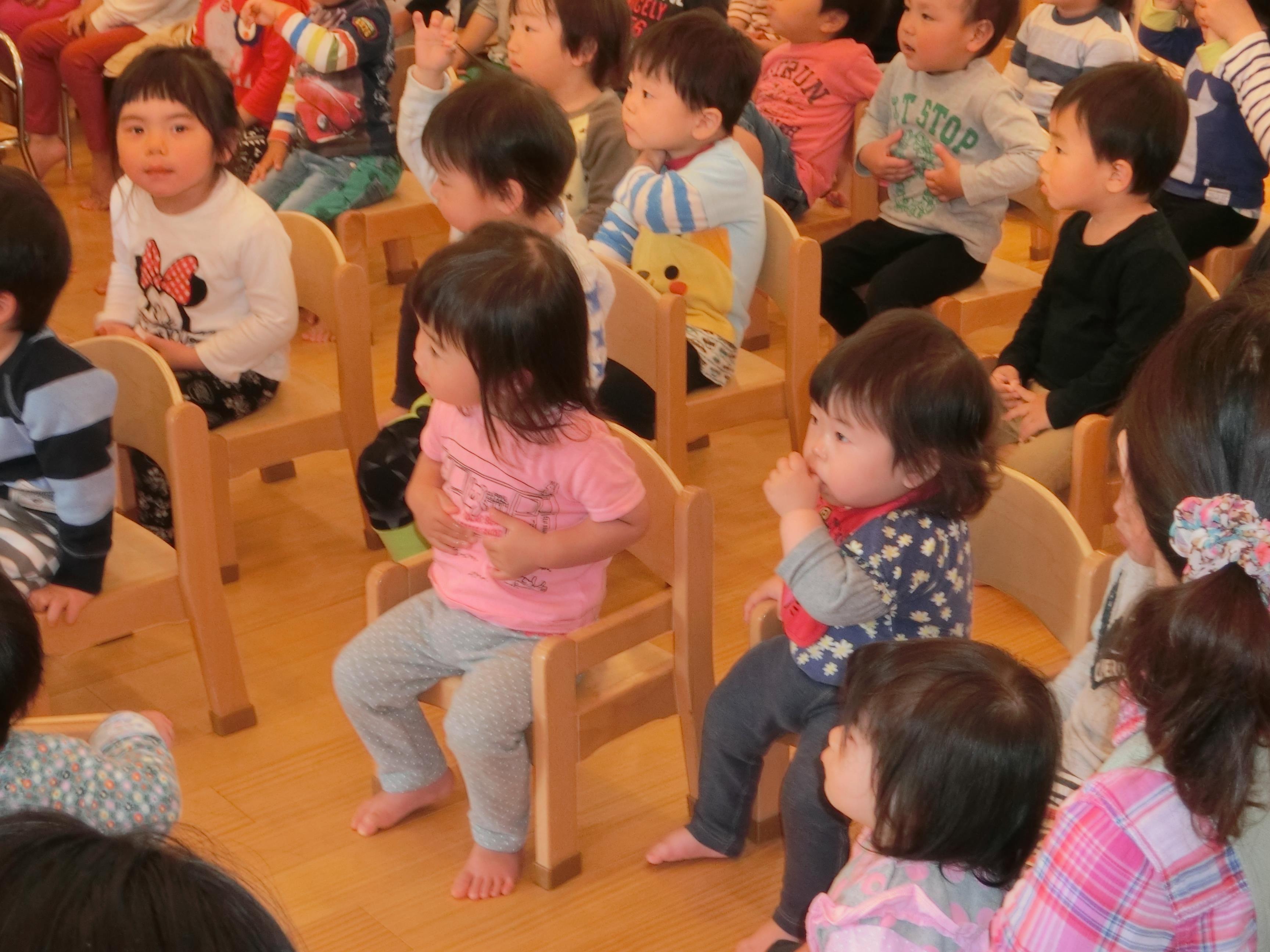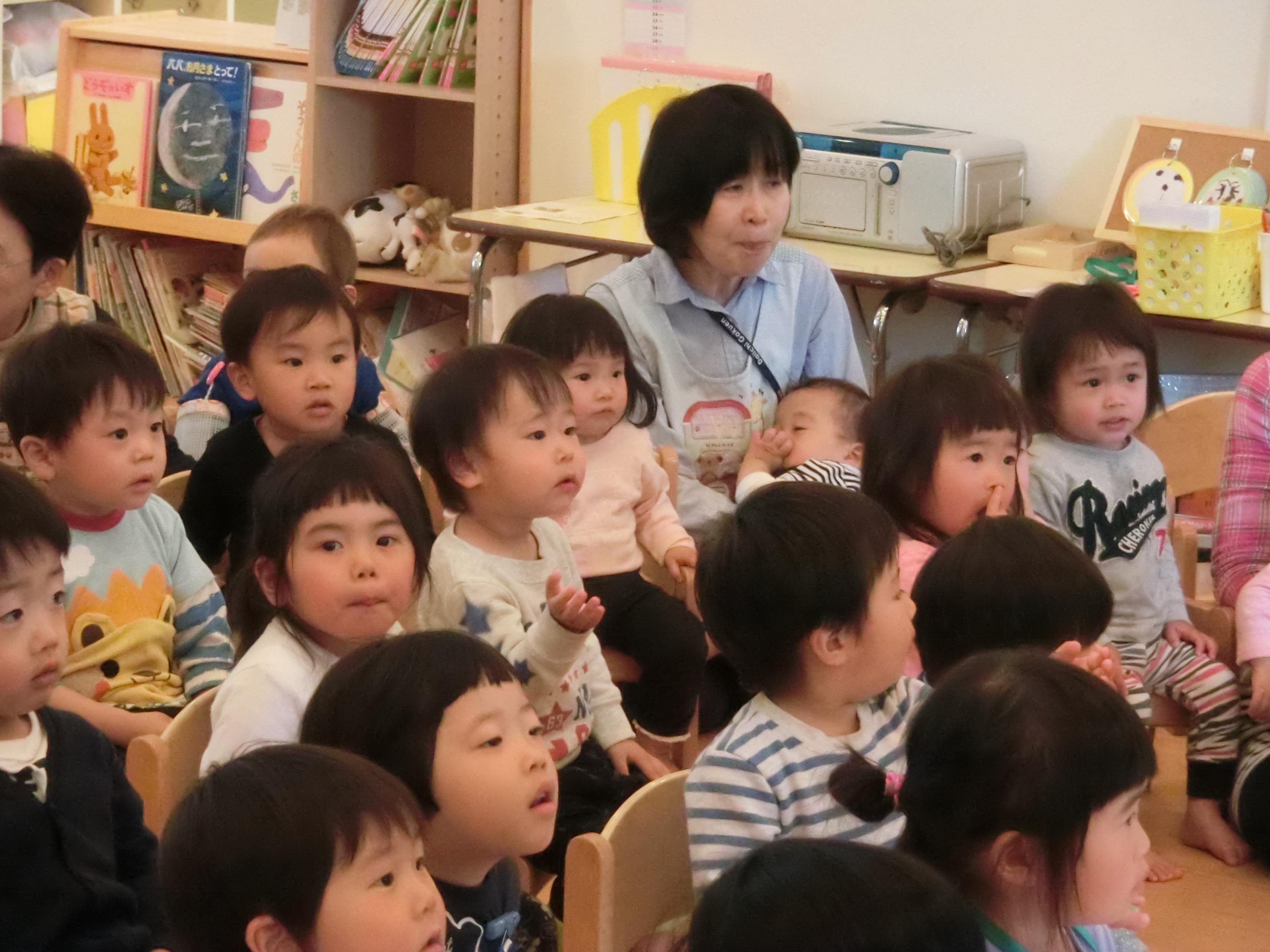 |  | 先生の歌とピアノに1歳児さんはつい「うとうと・・・zzz」 微笑ましいです。 | 「♪ちょうちょになりました~」 ついつい、みんなも飛び出していきました。 大好きなお話に引きこまれた、一時でした。 |