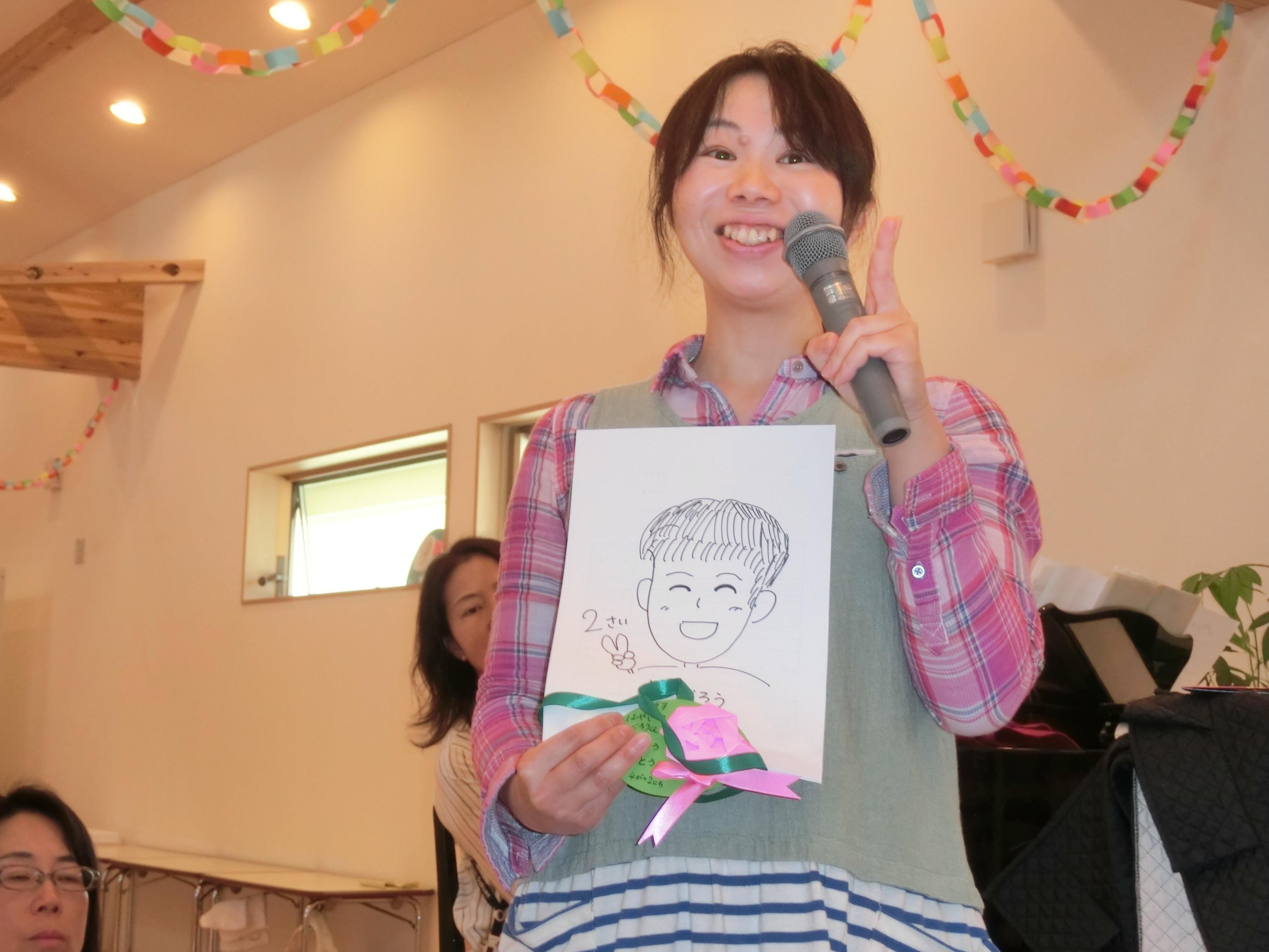 |  | | 0・1・2歳児さんも、お友だちの発表をしっかり見て、応援することを頑張っています。 | 1歳児の誕生児のお休みを、担当職員自作の似顔絵で紹介しました。見かけたら、声を掛けてくださいね。 |