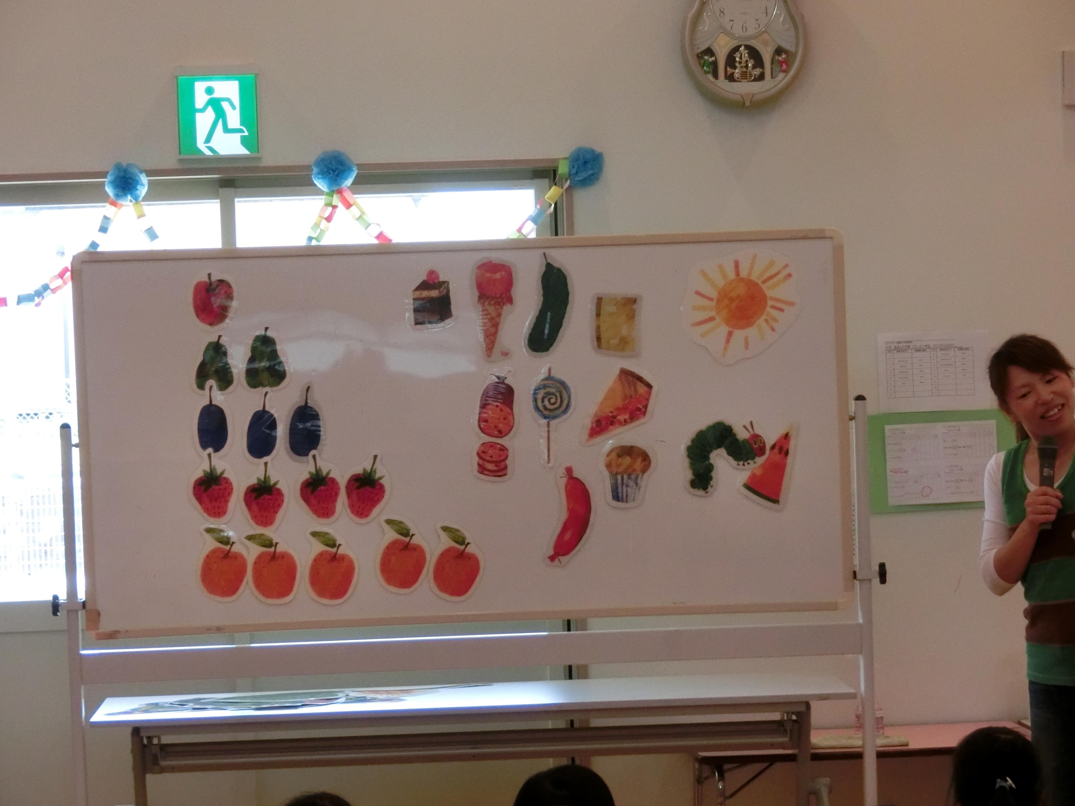 |  | | 先生達からのお楽しみは、はらぺこあおむしのペープサートです。ピアノの伴奏に合わせて、一緒に歌いながら、楽しみました。 | 「♪おなかがいたくなりました~」ではあおむし君と一緒にお腹をおさえて・・・なりきっています。 |