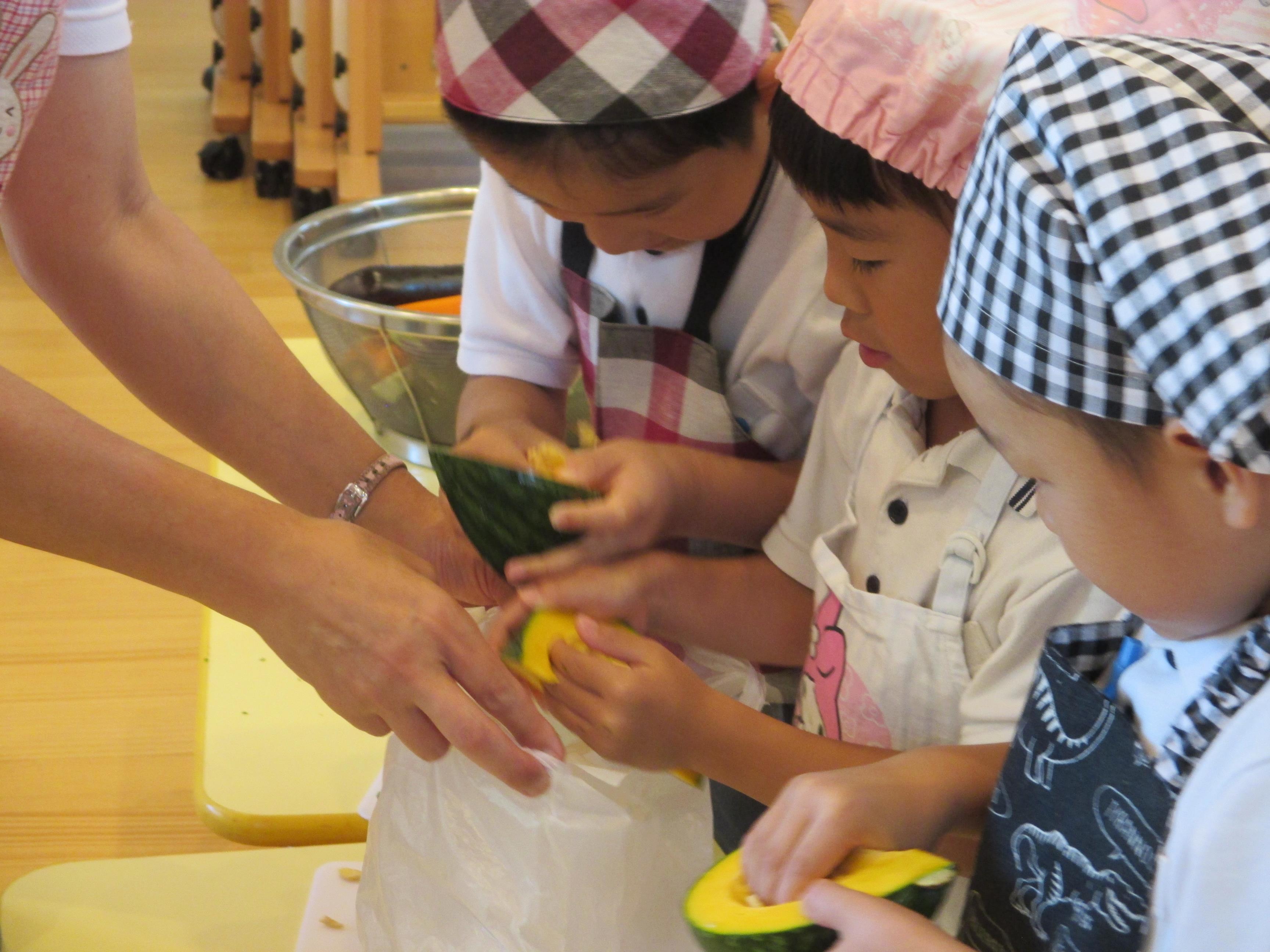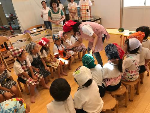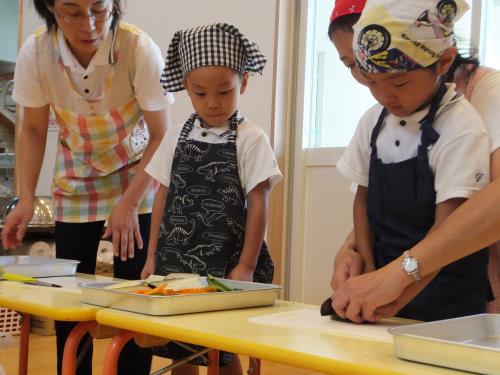 夏のお楽しみ会~クッキング・タイム~ 次は、クッキング・タイムです。お昼寝もしっかりして、元気回復!! ぞう組さんはしっかり話を聞いて野菜の切り方を覚えます。ねこの手のように自分の手を丸めて、手を切らないように気をつけます。野菜を切って中の種を観察しました。ピーマンの種やナスの種、カボチャの種を観察し、種の色やつき方を見比べたりしました。また、ニンジンの種を見ると・・・「ないね・・・。」何故かな??と疑問も出てきました。その何故かなという理由も年長ならではですね。みんなで今度考えてみよう!!という結論になりました。考えて答えを導きだすと、きっとみんなの心に残るはずです。 みんな、エプロン・三角巾がとっても似合っています。少しお母さんになった気分で、ドキドキしながら順番を待ちます。上手に切れるかな?美味しいカレーが出来るかな?きっとみんなの気持ちがぎゅっと詰まった美味しいカレーが出来上がるはずです!! 実は・・・ぞうぐみさん、野菜を切るのは7月になって3回目です。最初はプランターで育てているオクラを切ったとき。2回目は、うさぎ組さんから分けてもらったナスを切ったとき。そして今回で3回目!!いろいろな野菜を切ります。もちろん、こども園で収穫した野菜も入っていますよ!! ナス、ピーマン、人参、かぼちゃ。種の付き方、野菜の硬さ、色、比べてみるとそれぞれ違う事も分かりました。 給食室に「おいしくしてください!!」とみんなで持っていきました。 夜の給食が楽しみです♪  |  |