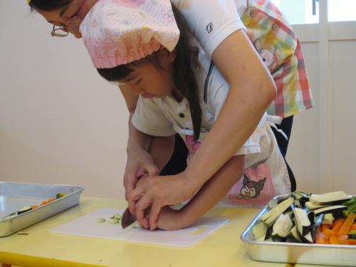 |  |  | | 次に切るお友だちは、ドキドキ!!切れるかな? | 友だちの切る様子を見て、学びます!! | ネコの手上手ですね!! |
