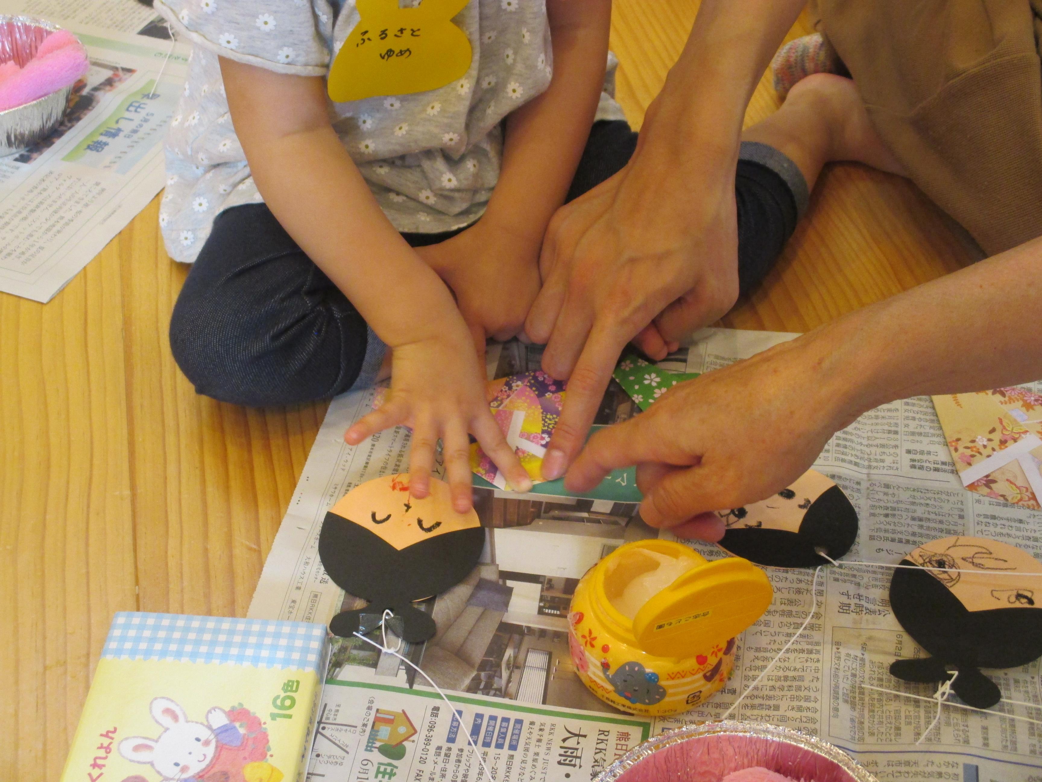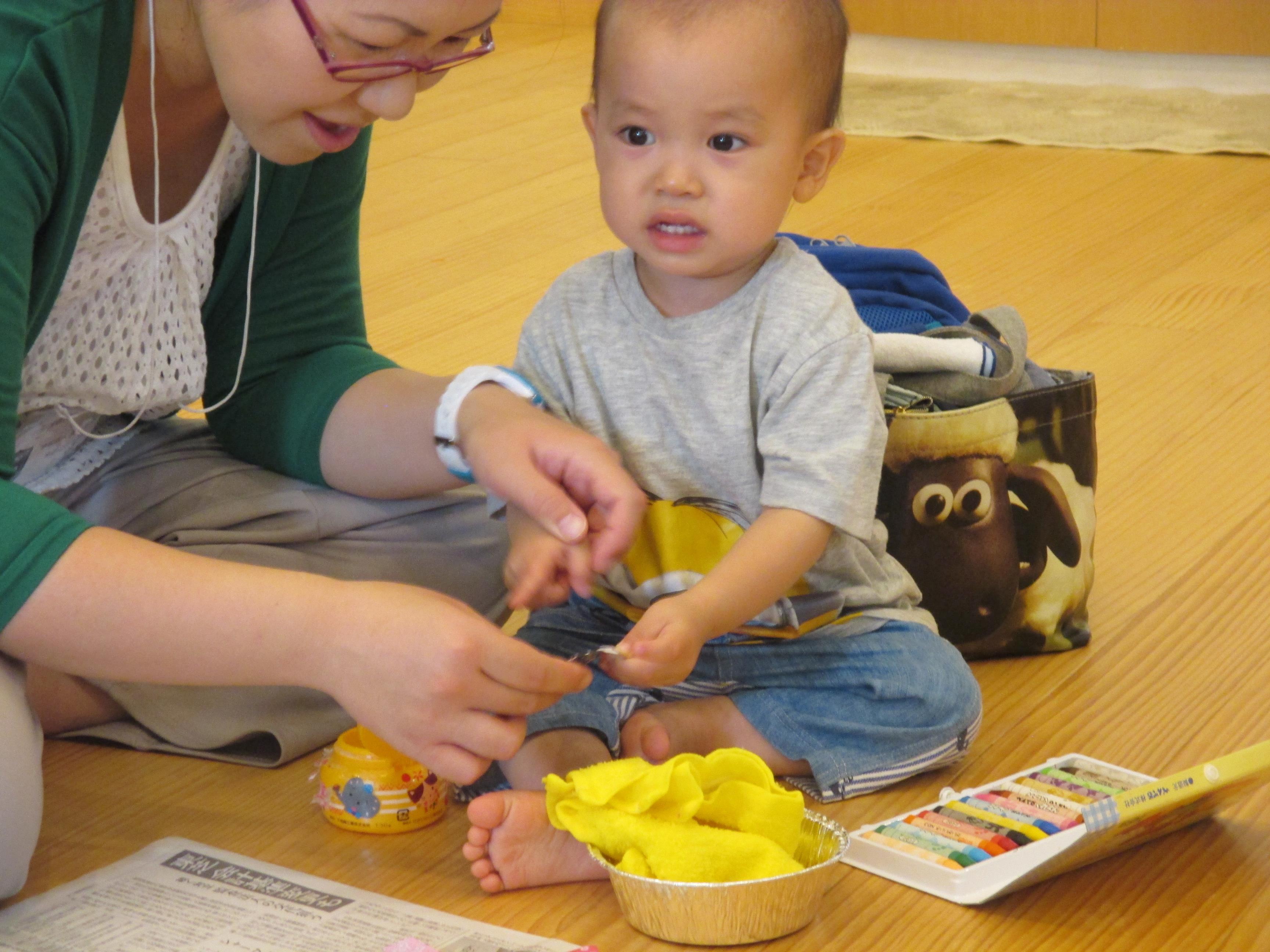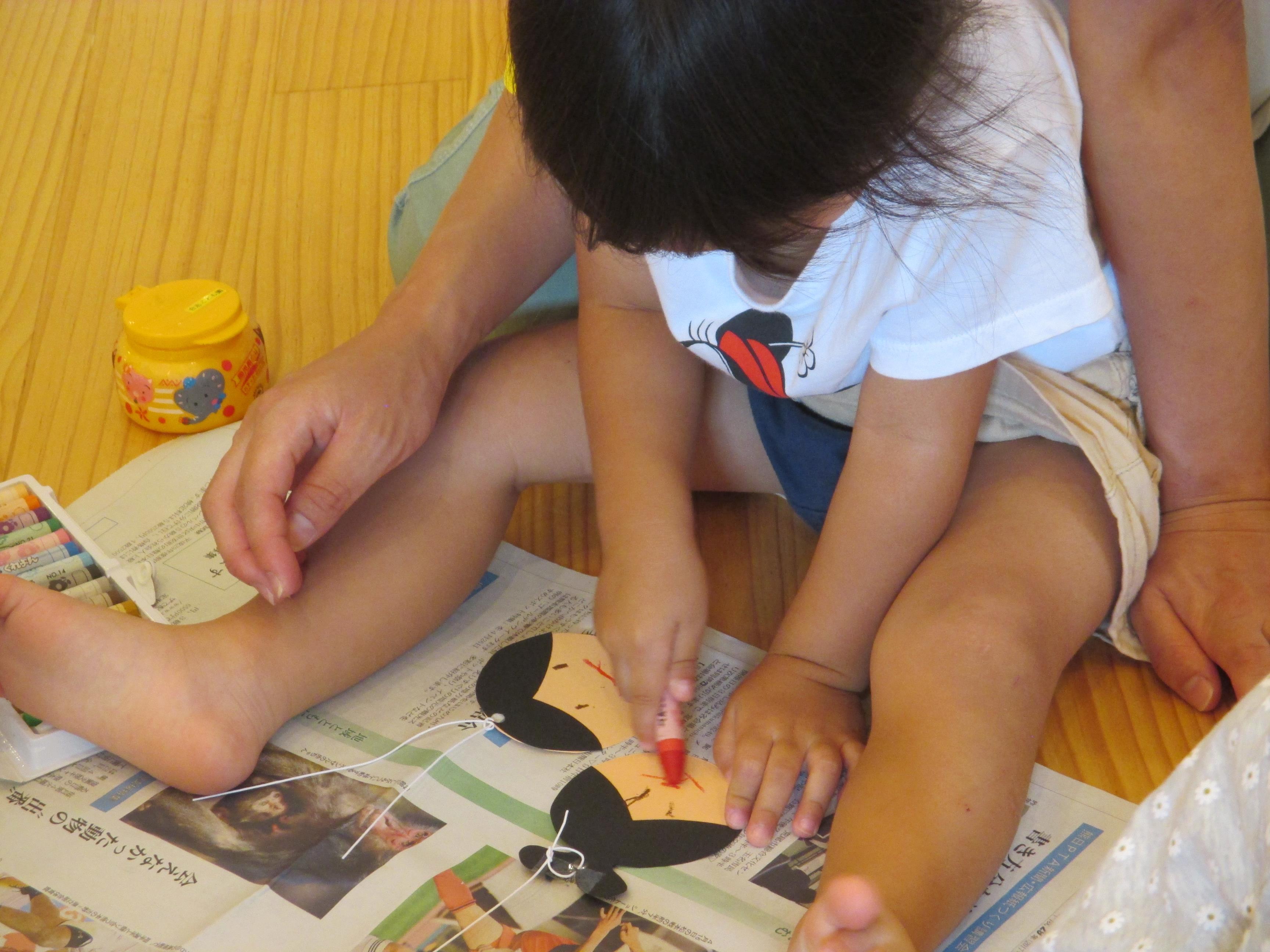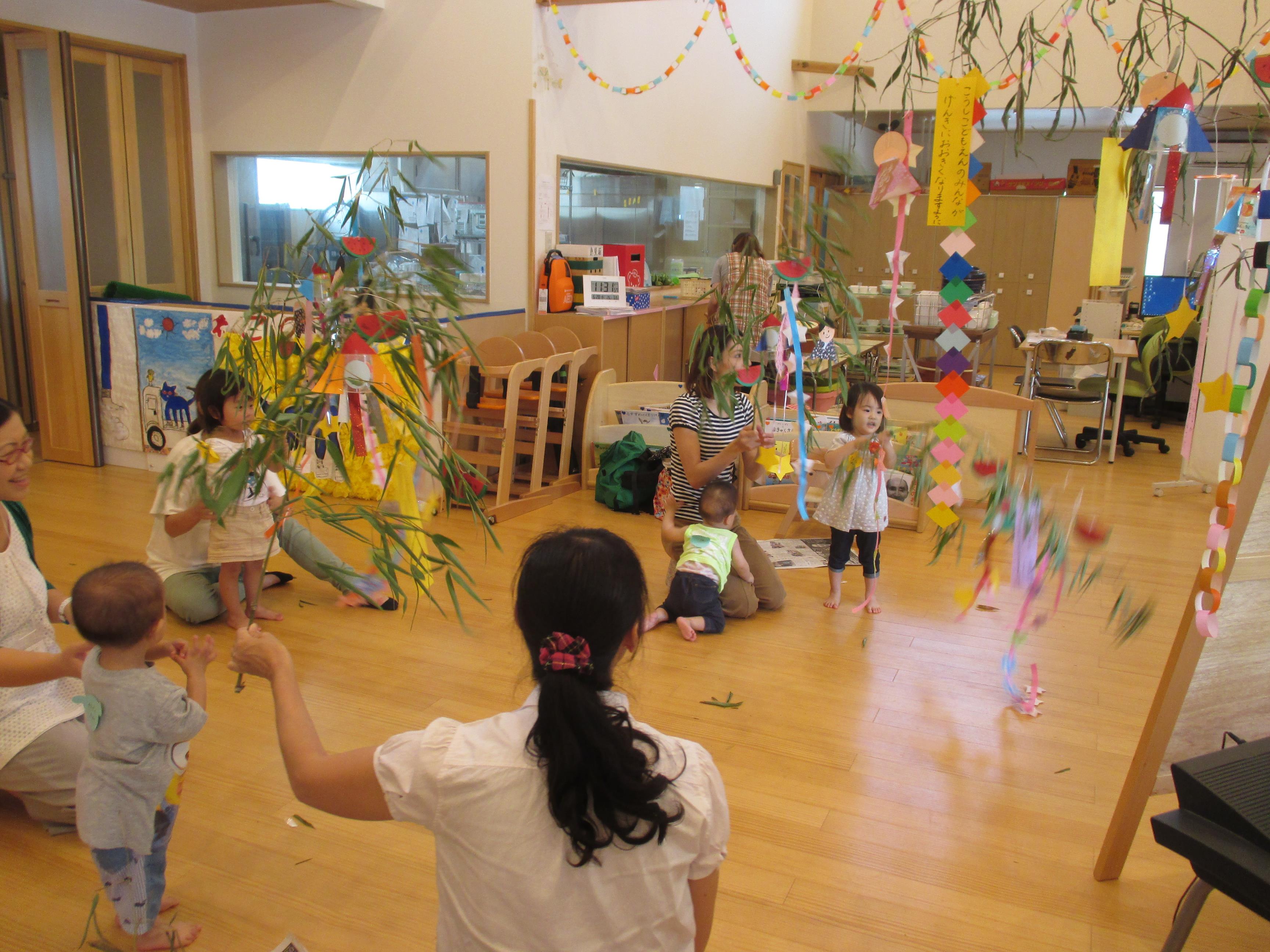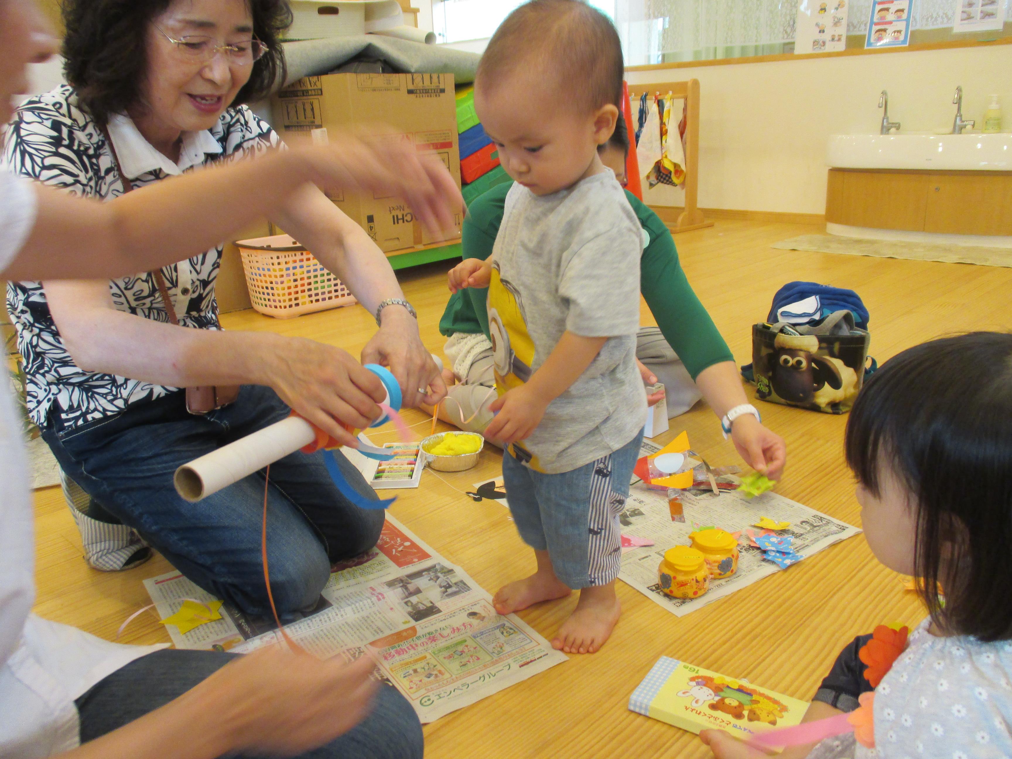|  |  | 「おかあさん、押えててね」 たね、たくさん描くんだぁ~ | 「僕は黄色いテープがいいよ」ちゃんと自分の意見を先生に伝えて、材料をもらう事もできました | ♪ささのは さらさら~♪ 出来上がった笹飾りを持ってみんなで、たなばたさまを歌いました。楽しい会となりました。 |