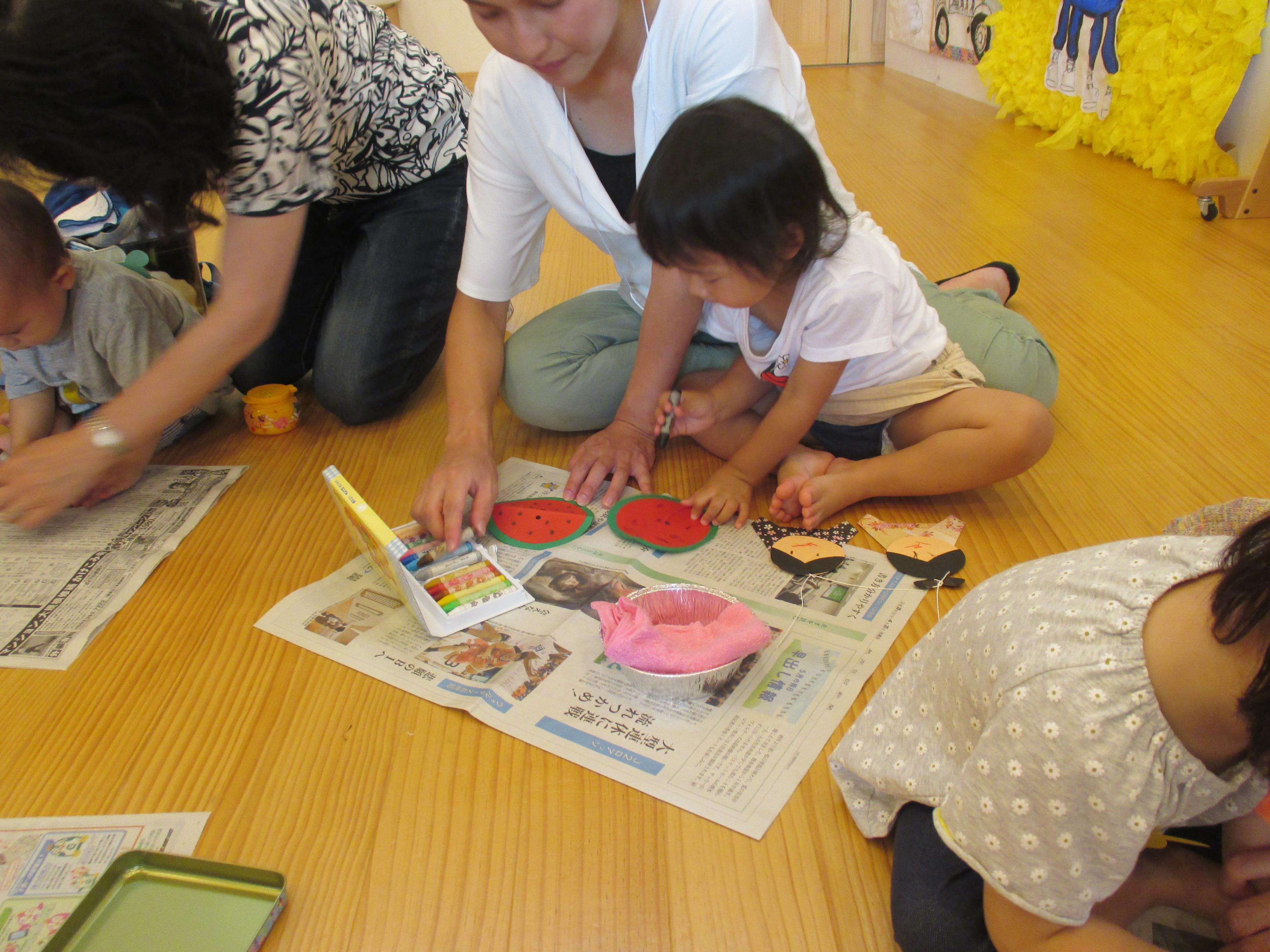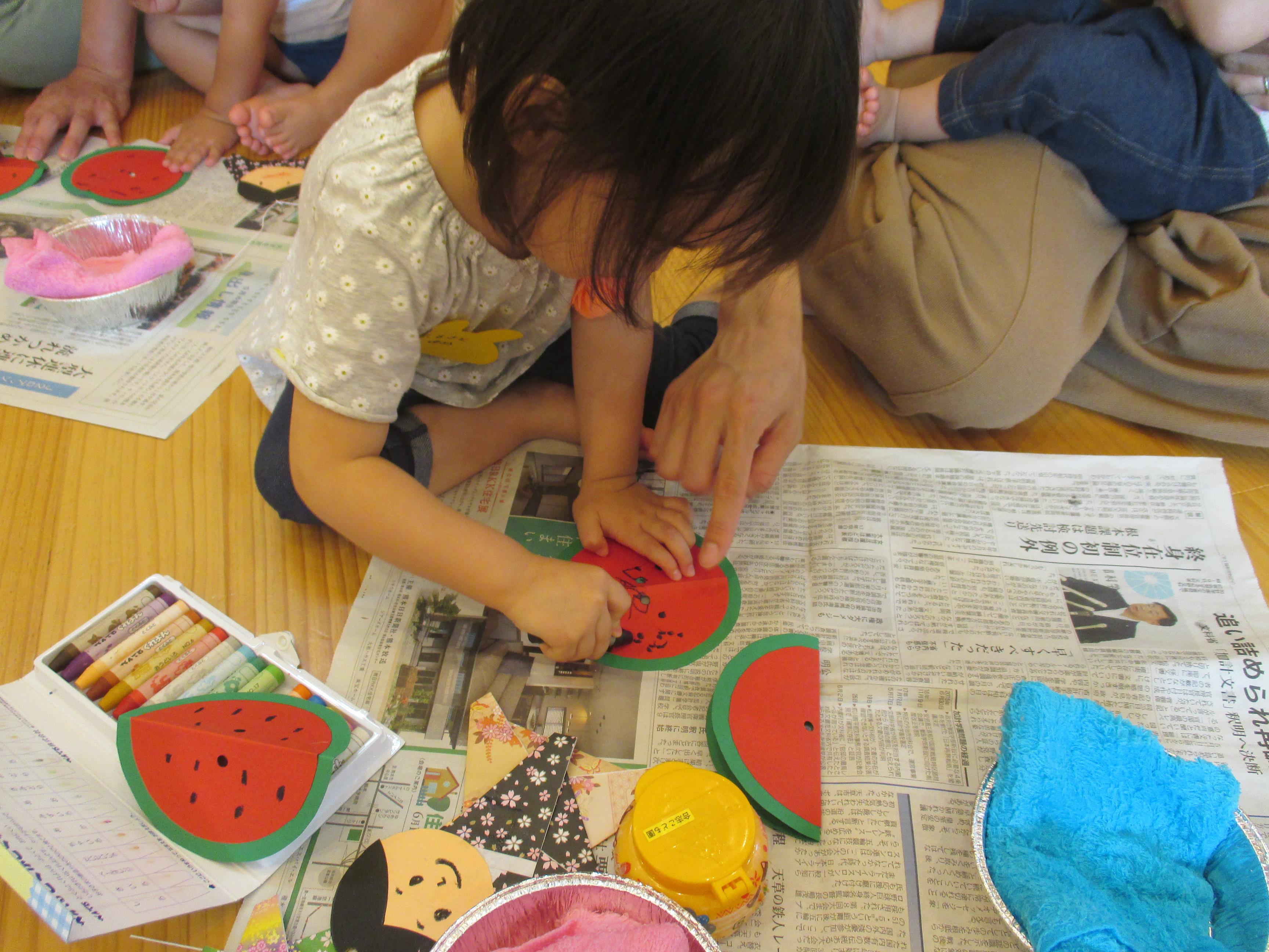 |  |  | | お母さんや先生と一緒に、くるくるくる!とのりを塗り広げました。 | お母さんに手を添えてもらって、のりをつけたよ。「ちょっと変な感じだよ」 | すいかの種を ”ちょんちょん”って描けたよ。弟の分もだから大変なんだよ。 |