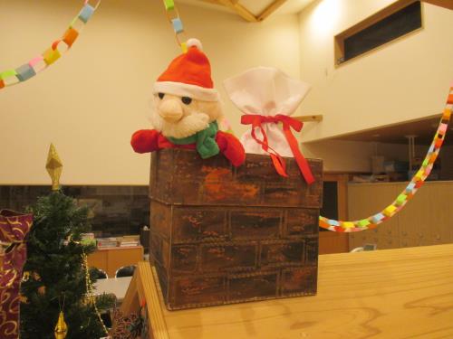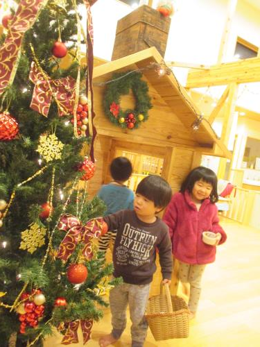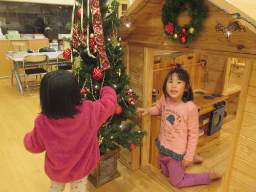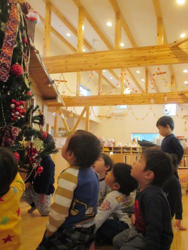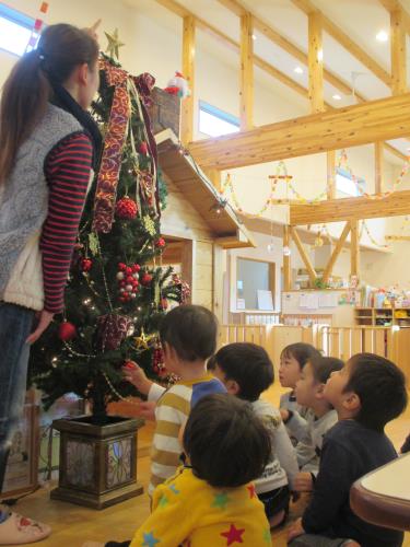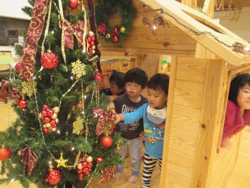 ♪まっかなおなはの~トナカイさんは・・・♪ こども園では12月の歌が各エリアで流れ、クリスマス一色になってきました。ままごとエリアも日に日にデコレーションされていき、お家より高いツリーが飾られました。ツリーを見上げては、目をキラキラさせています。ある朝、屋根に煙突(園長作です)が!!サンタクロースがプレゼント持って入っていこうとしていました。子ども達は登園すると直ぐに、「サンタさんが煙突にいるよ」「プレゼントをもってる」「だれのかな?」「こども園のじゃないよ。だってまだ、クリスマスじゃないもん」「なにが入っているかな・・・」等々会話は弾み、期待一杯の一時となりました。 さあ!今年のクリスマス会には、サンタクロースは来てくれるでしょうか?・・・・ きっとツリーの光をたどってきてくれると思います。 子ども達の夢をかなえるために!  |  |  | 大きなリボンやきらきらの星 一番上にはお星様が輝いているよ | 見上げるように、大きなツリー。しっかり観察して、制作に取り組みました | ままのお迎えをツリーハウスで遊んで待ってたよ |