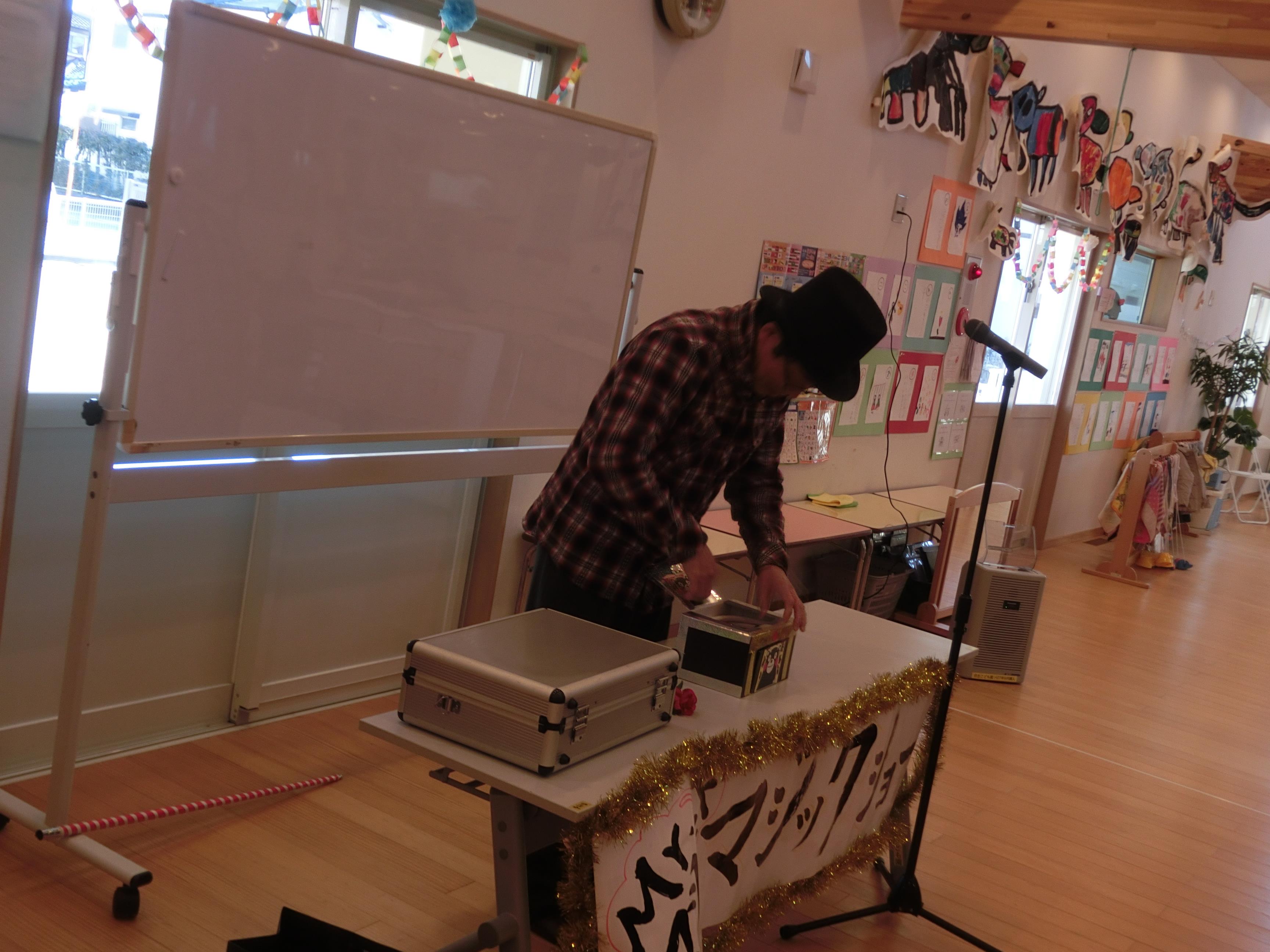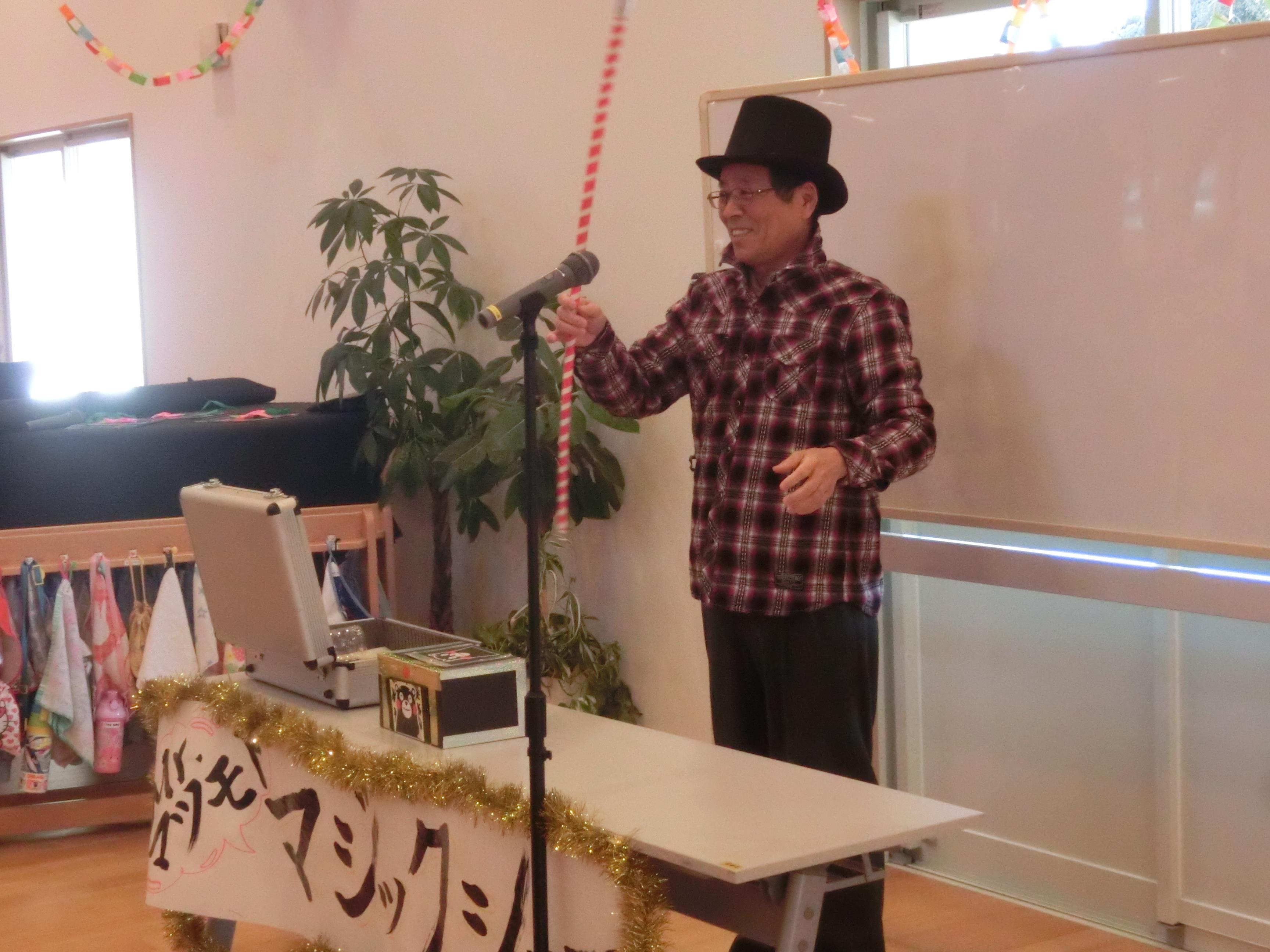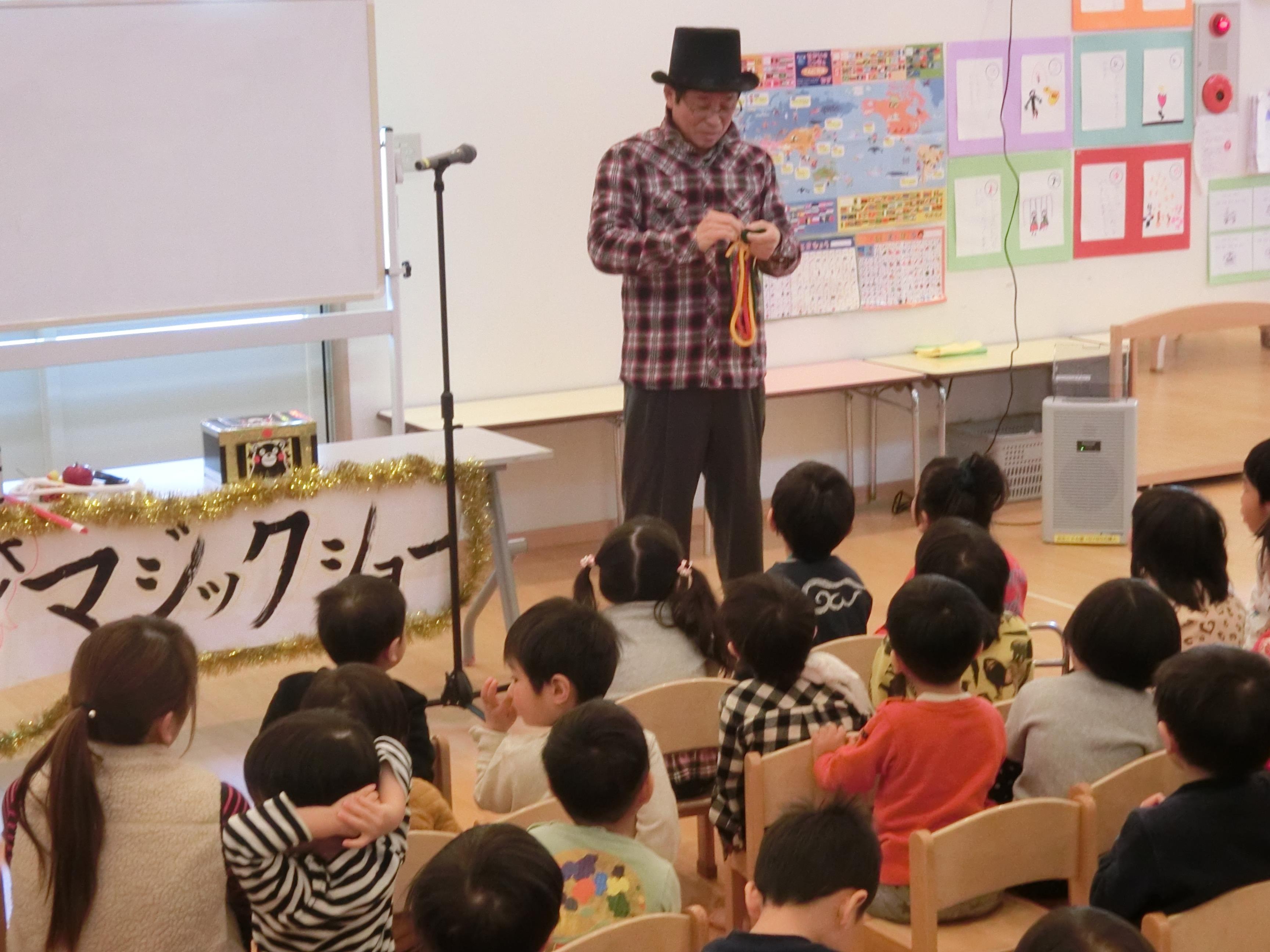 1月のお誕生会にマジシャンに来ていただきました。 ひらひらハンカチが一瞬にしてステッキに変わると、「すごーい」「どうして?」とこども達の心は釘付けとなってしまいました。このマジシャン・・・・実は学園アドバイザーの松本先生なのです。こども達を喜ばせたい!と趣味ではじめられたマジック。腕前もどんどん上達して、各園に呼ばれ披露されています。松本先生はこども園の第三者委員でもあり、日頃から行事や園全体の事を温かく見守っていただいています。「はじめてみる事・子ども達が喜ぶものを」と考えて沢山のマジックを見せていただきました。次々展開されるマジックにこども達は大喜びし、楽しい一時を過ごす事ができました。 最後には「これからも色々頑張る子どもでいられるように」とエールとクラッカーで応援していただきました。  |  |  | 掛け声「1・2・3」手伝ってね。 「1・2・3」パッ! | 「え~どうなってるのかなぁ」 | 「さあ~ふしぎな箱だよ」 「何もないのに・・・あら?あら?何かある」 |