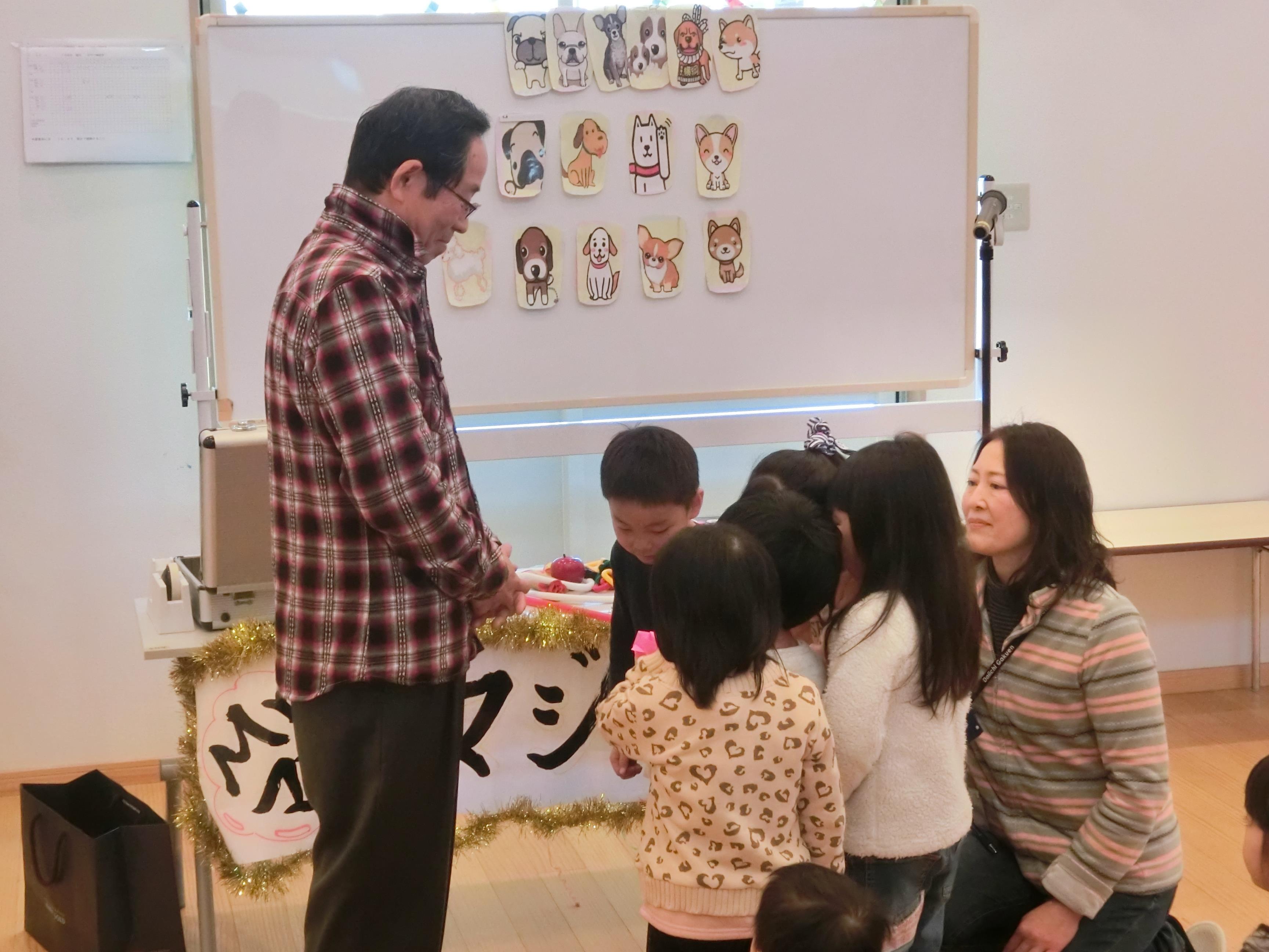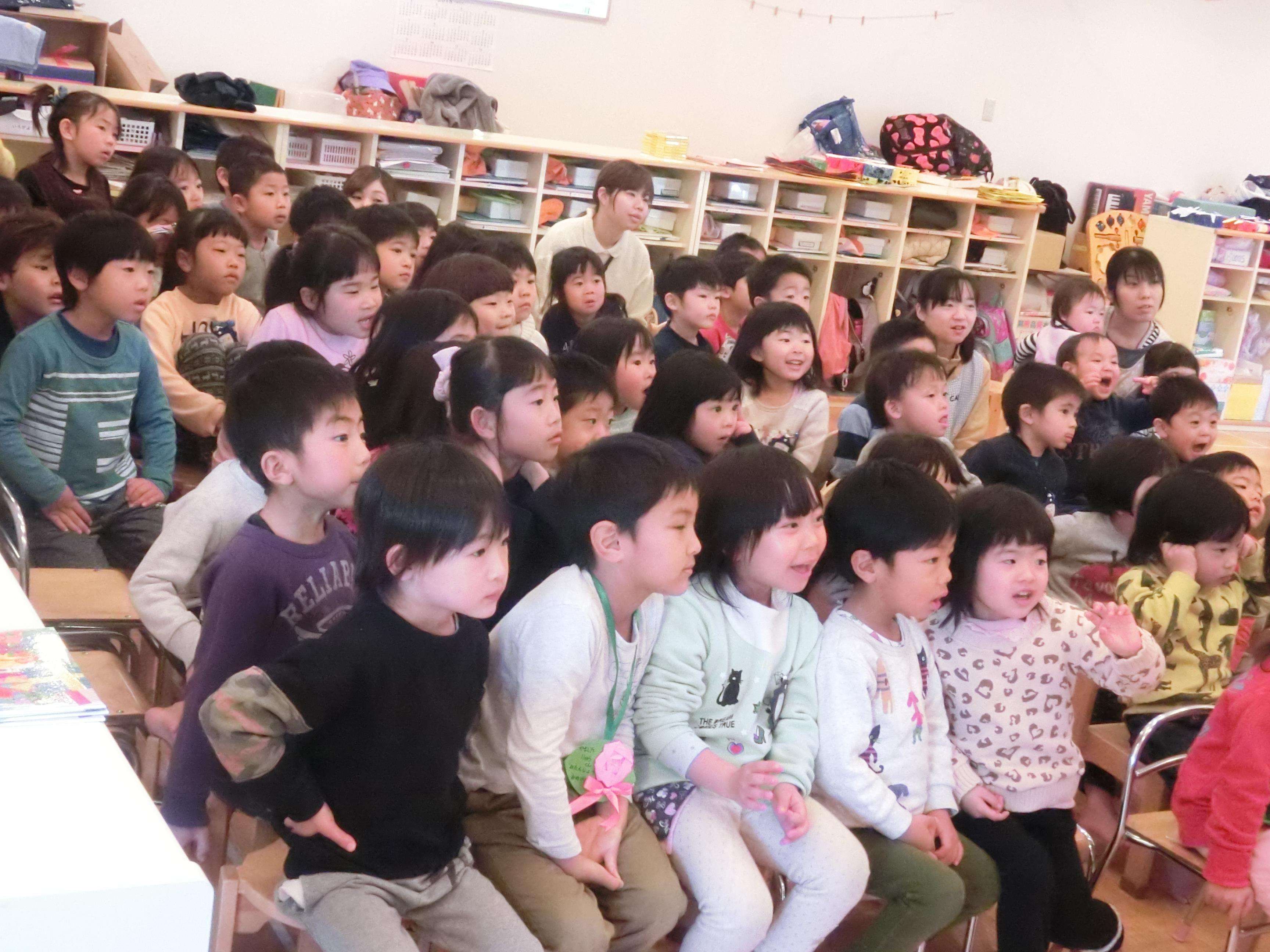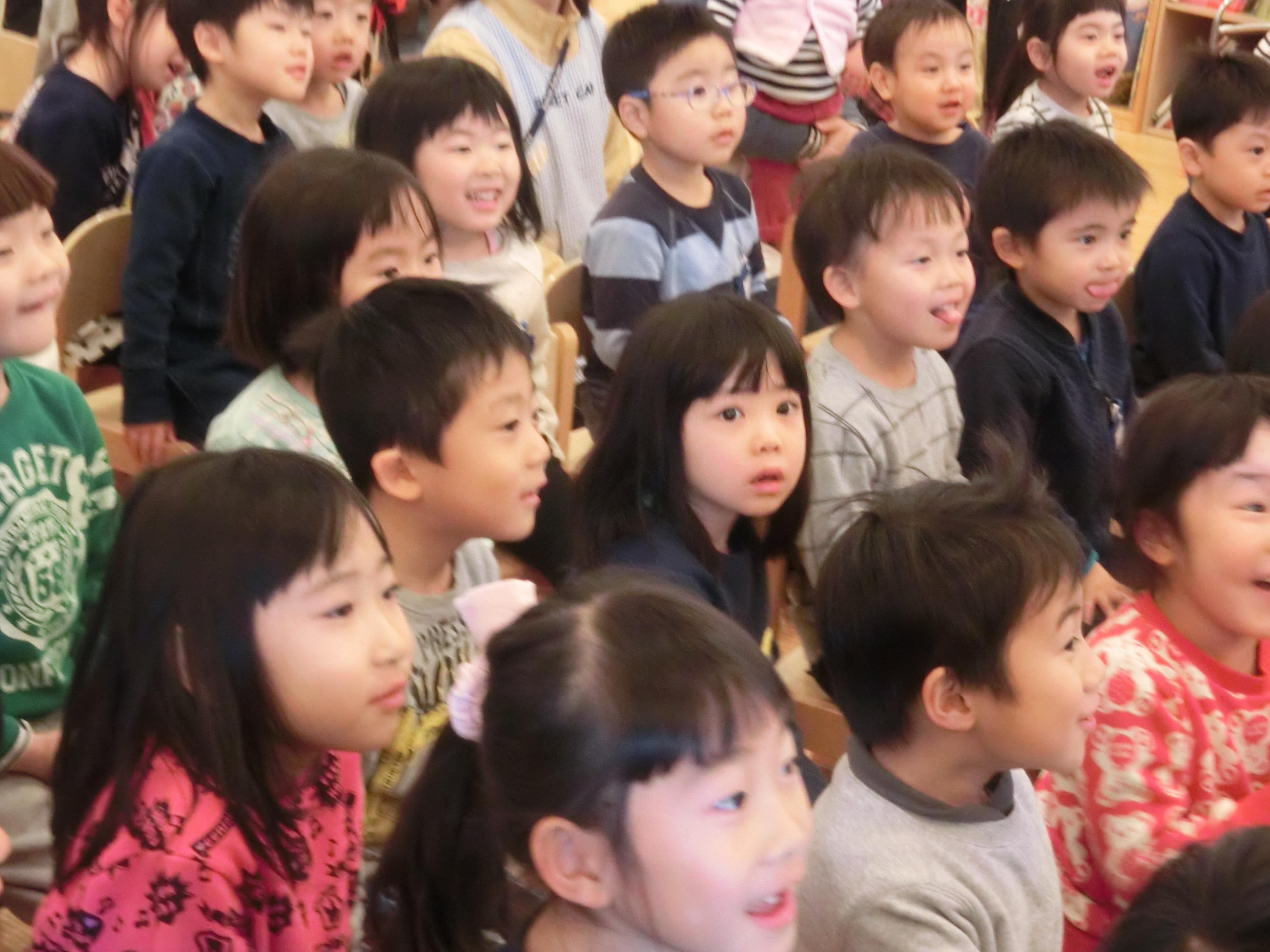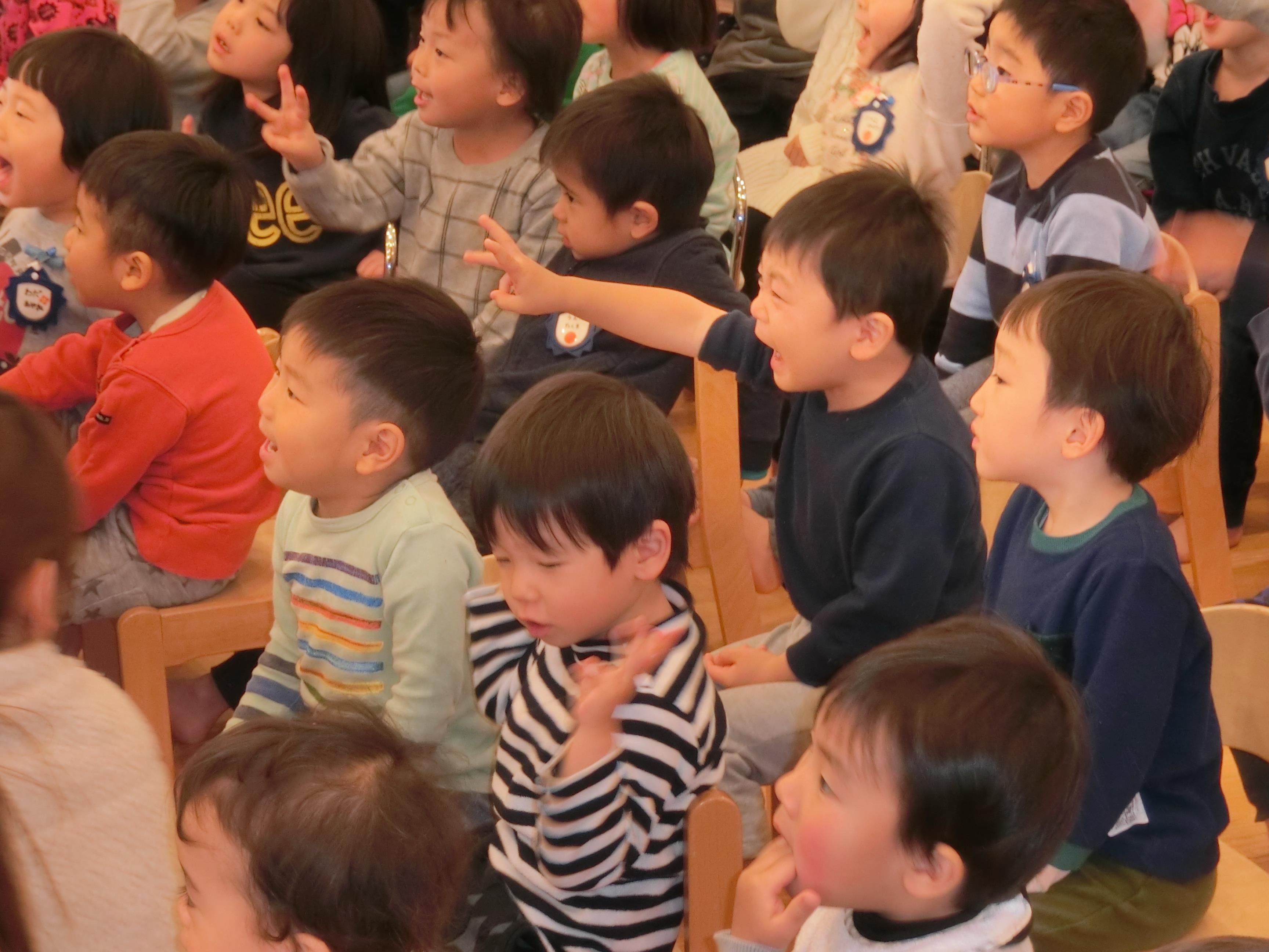 1月のお誕生会にマジシャンに来ていただきました。 ひらひらハンカチが一瞬にしてステッキに変わると、「すごーい」「どうして?」とこども達の心は釘付けとなってしまいました。このマジシャン・・・・実は学園アドバイザーの松本先生なのです。こども達を喜ばせたい!と趣味ではじめられたマジック。腕前もどんどん上達して、各園に呼ばれ披露されています。松本先生はこども園の第三者委員でもあり、日頃から行事や園全体の事を温かく見守っていただいています。「はじめてみる事・子ども達が喜ぶものを」と考えて沢山のマジックを見せていただきました。次々展開されるマジックにこども達は大喜びし、楽しい一時を過ごす事ができました。 最後には「これからも色々頑張る子どもでいられるように」とエールとクラッカーで応援していただきました。  |  |  | 掛け声「1・2・3」手伝ってね。 「1・2・3」パッ! | 「え~どうなってるのかなぁ」 | 「さあ~ふしぎな箱だよ」 「何もないのに・・・あら?あら?何かある」 |