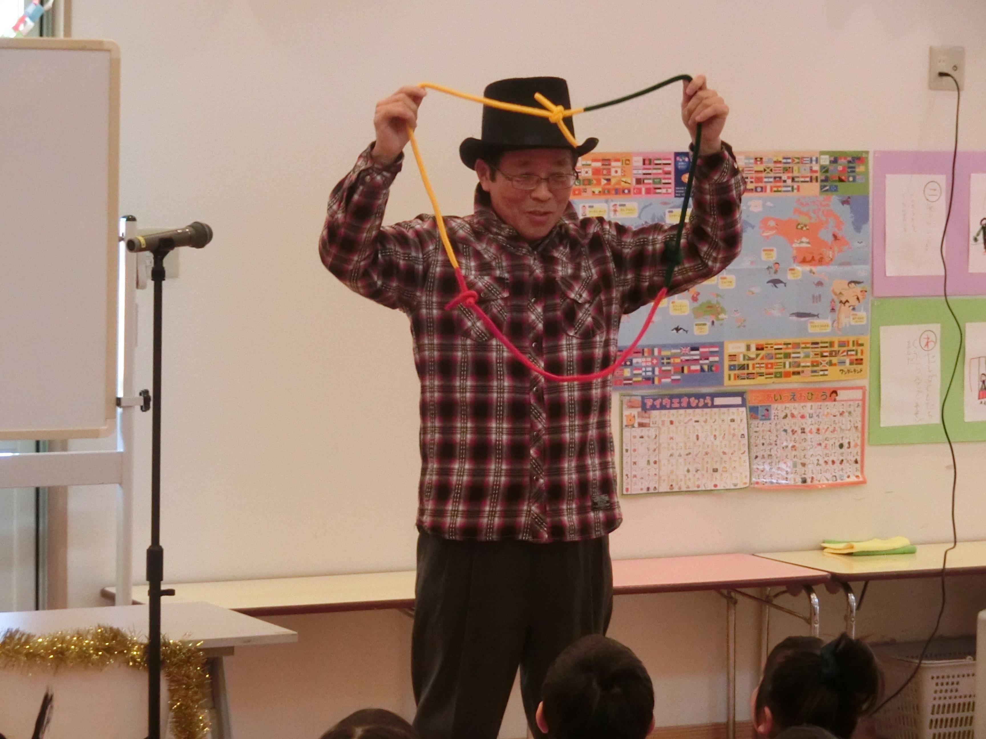 |  |  | 「それぞれの紐をむすんでいきます・・・」 魔法をかけると・・・ | パッ! 「あれあれ。大きな輪になちゃったよ」 | 「たのしいマジックをしていただいてありがとうございました」 「おもしろかったです」 |