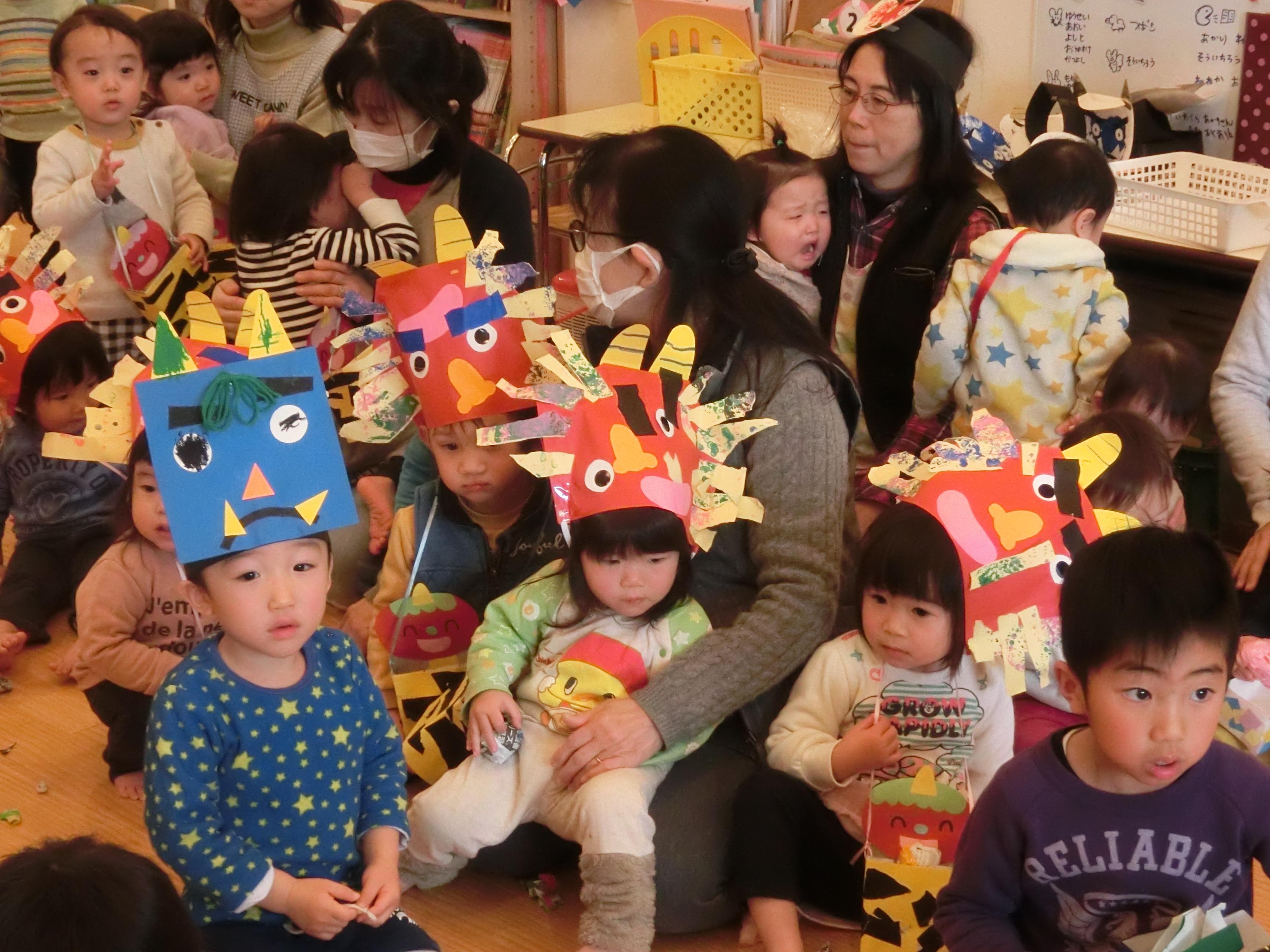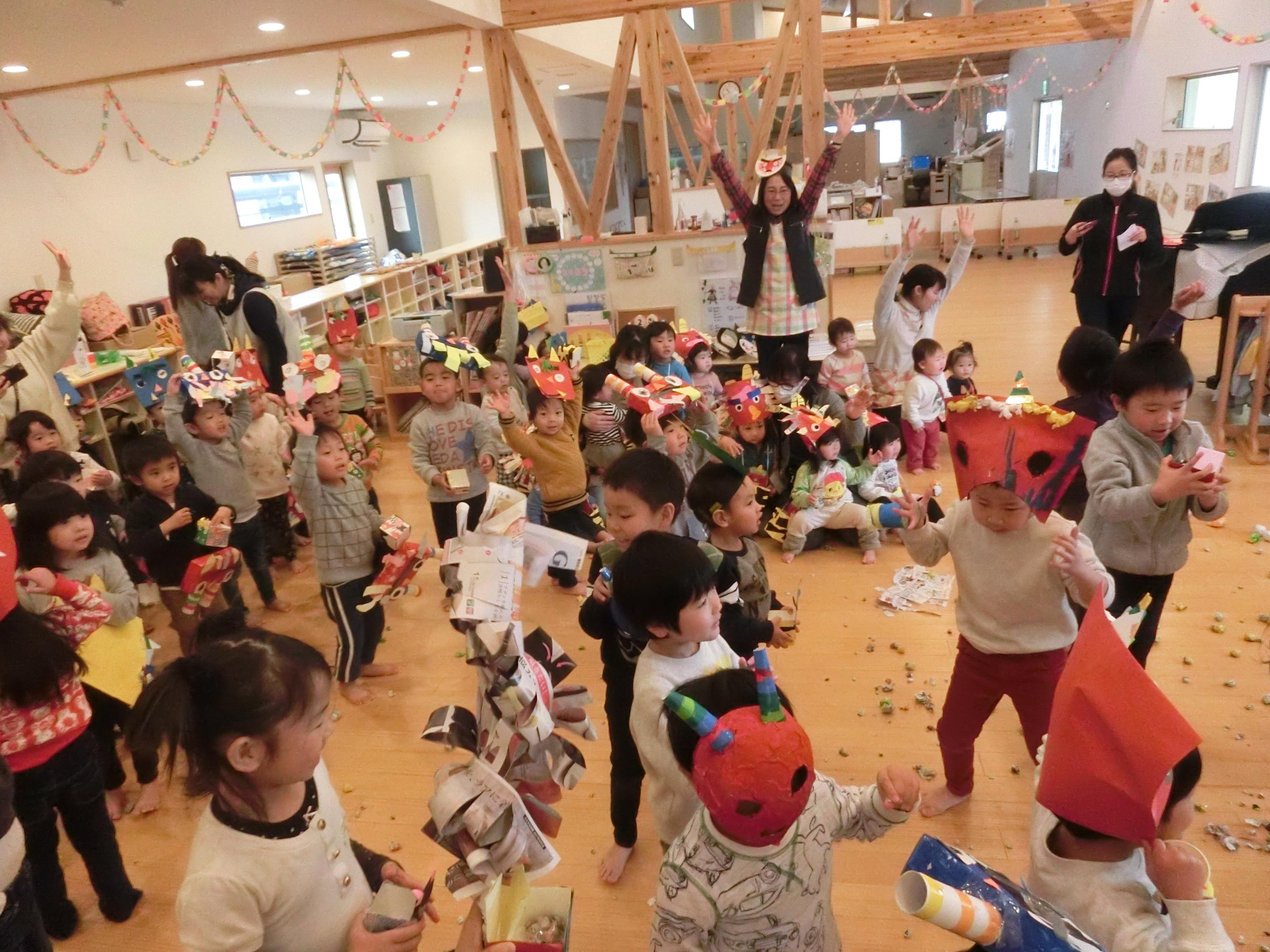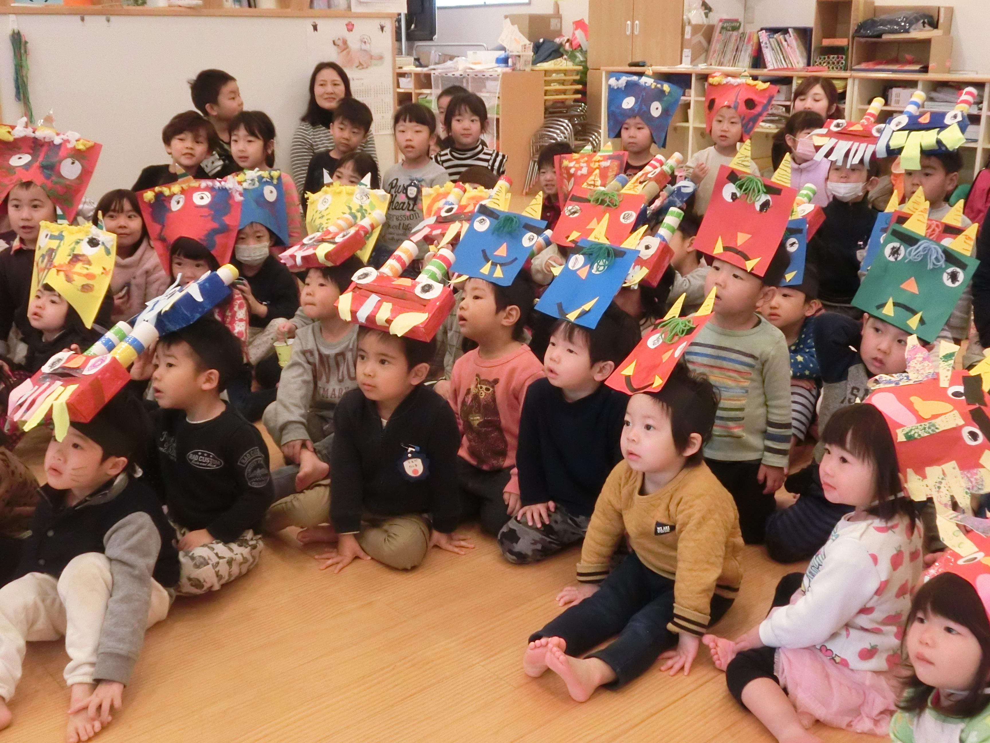 季節行事とし、取り組んでいる2月の豆まき。それぞれの年齢によるお面や桝の制作をして参加しました。年長組の風船を使った「張りぼての面」隙間なく貼り合わせる事で、強度を増したりリアルになったり、一人ひとりが根気よく取り組んでいました。みんなの前に登場したぞう組の鬼さんは、「おにだぞ~」と恥ずかしそうでした。その鬼さんの優しさが伝わったのか、小さいお友だちもやさしく「おには~そと」と新聞豆を投げていました。これから園を巣立っていく年長さんもやさしく鬼をやっつけてもらったので”やる気満々”で頑張ってくれることでしょう。 先生から、鬼の苦手ないわしやヒイラギの話・豆まきの由来の話を聞き、体も心も強い人になれるよう、一斉に豆まきが始まりました。突然の黒鬼の登場には歓声が悲鳴に変わってしまいましたが、子ども達の力を合わせて無事鬼退治も出来ました。園児それぞれが作った鬼のお面はご自宅でも活躍したでしょうか? 健康で、良い春を迎えられますように・・・  |  |  | 「なになに?」 興味津々のりす組さん。 | 「さあ!くいずですよ」 「鬼がきらいなさかなはどれだ?」 | 「う~ん、むずかしいね」 「どのさかなかなあ・・」 |
